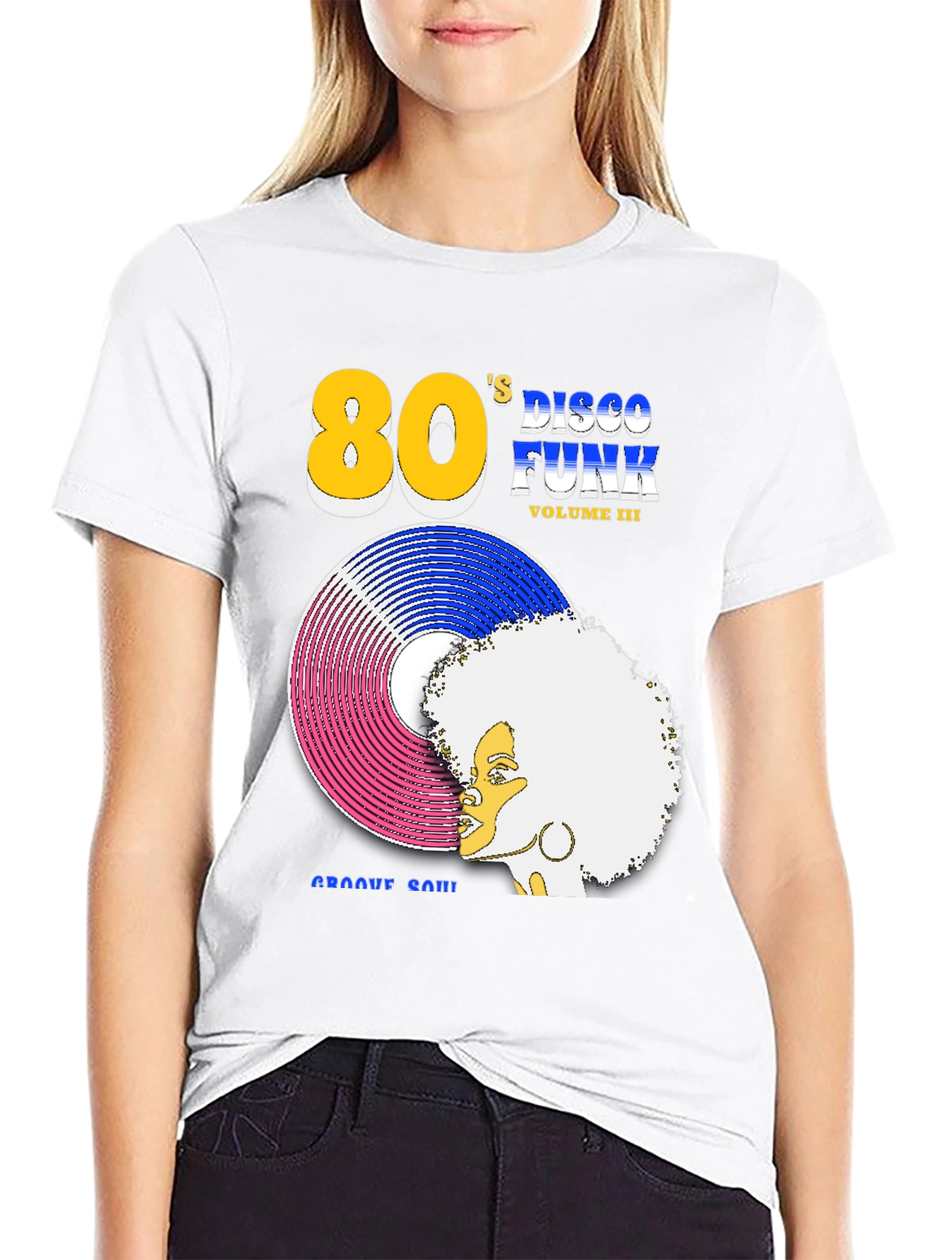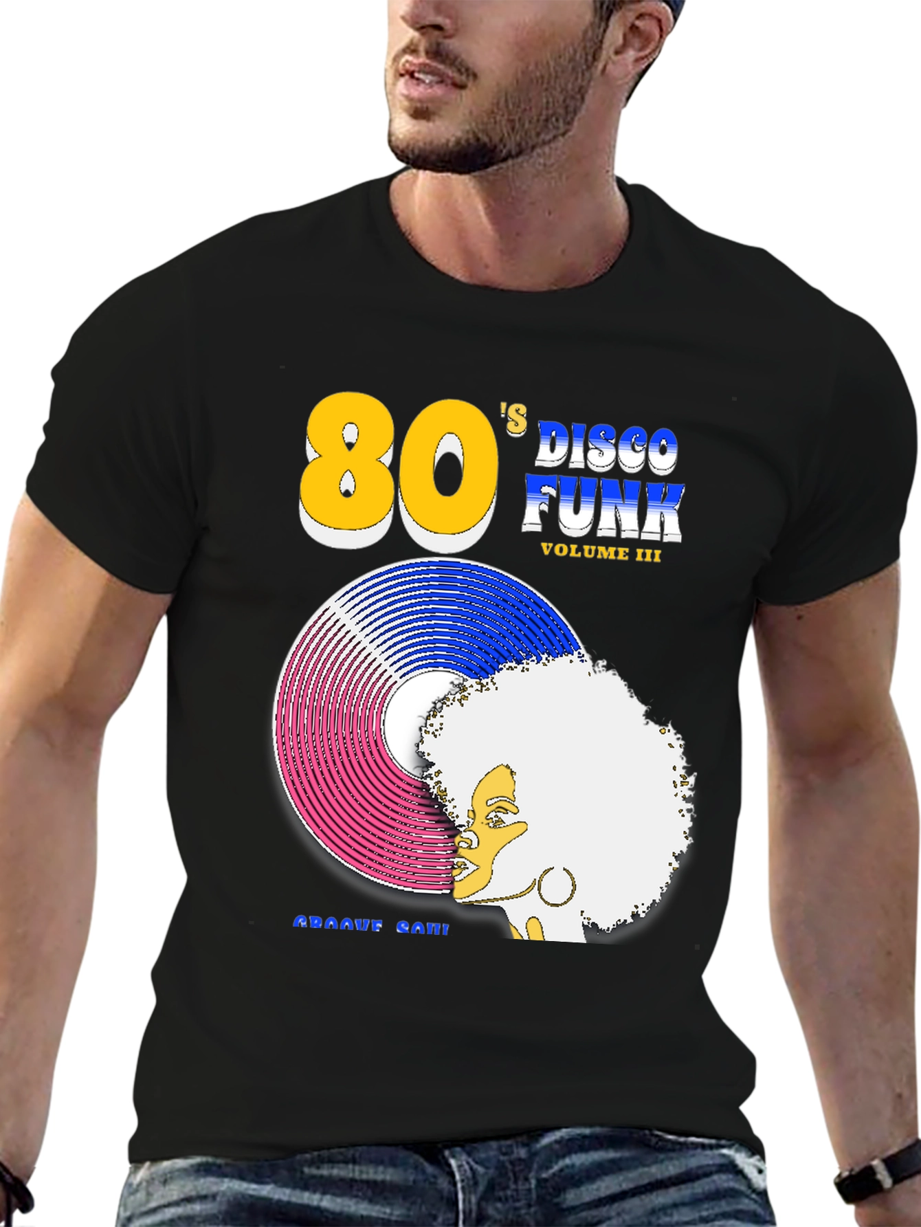 Step back in time with this vibrant black T-shirt featuring a retro-inspired design. The bold graphic showcases "80's Disco Funk Volume III" with bright yellow and blue lettering, complemented by an artistic rendering of a vinyl record and a woman with an afro. The design invokes a sense of nostalgia and musical flair. Made from a comfortable fabric, this shirt is perfect for everyday wear, music lovers, or anyone looking to make a stylish statement. Stand out from the crowd with this unique and eye-catching tee!