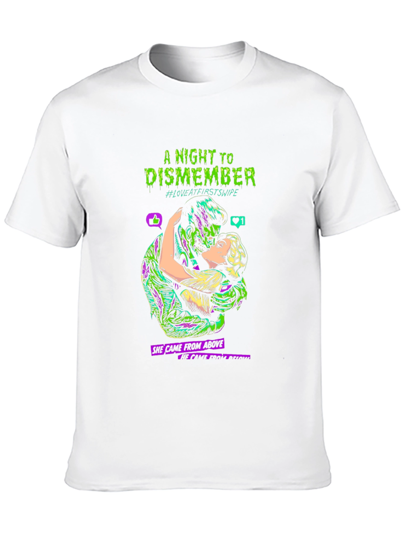 This unique black t-shirt features a vibrant and eye-catching design that is sure to turn heads. The graphic showcases a monster and a woman kissing, accompanied by the text "A Night to Dismember" and the hashtag "#LOVEATFIRSTSWIPE." Additional text says "She came from above, he came from below". The design incorporates bright green and purple hues, creating a visually striking contrast against the black backdrop. Perfect for those who love a touch of dark humor and want to make a bold statement. Wear it casually or as a fun Halloween costume piece.