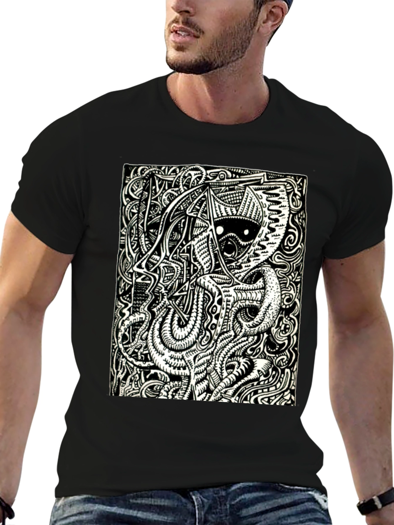 Make a statement with this striking black t-shirt featuring a unique abstract graphic print. The design showcases intricate line work creating an eye-catching visual. Made from what appears to be a soft and comfortable fabric, this short-sleeve tee offers both style and ease of wear. The detailed artwork is bold and modern, making it a standout piece for casual outings, concerts, or artistic events. Show off your individual style with this must-have graphic tee.
