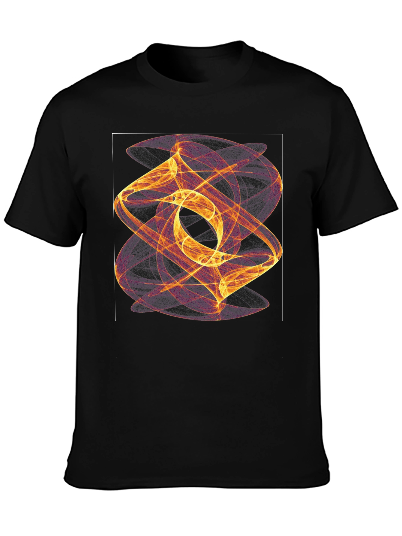 Elevate your style with this striking black t-shirt featuring a vibrant, abstract graphic. The design showcases swirling lines in hues of golden yellow and purple, creating a mesmerizing, modern art effect. Made from a soft, comfortable fabric, this tee offers a relaxed fit that's perfect for everyday wear. Whether you're heading to a casual gathering or want to add an artistic edge to your look, this shirt is sure to turn heads. Pair it with jeans or chinos for a cool, contemporary style that expresses your unique personality.