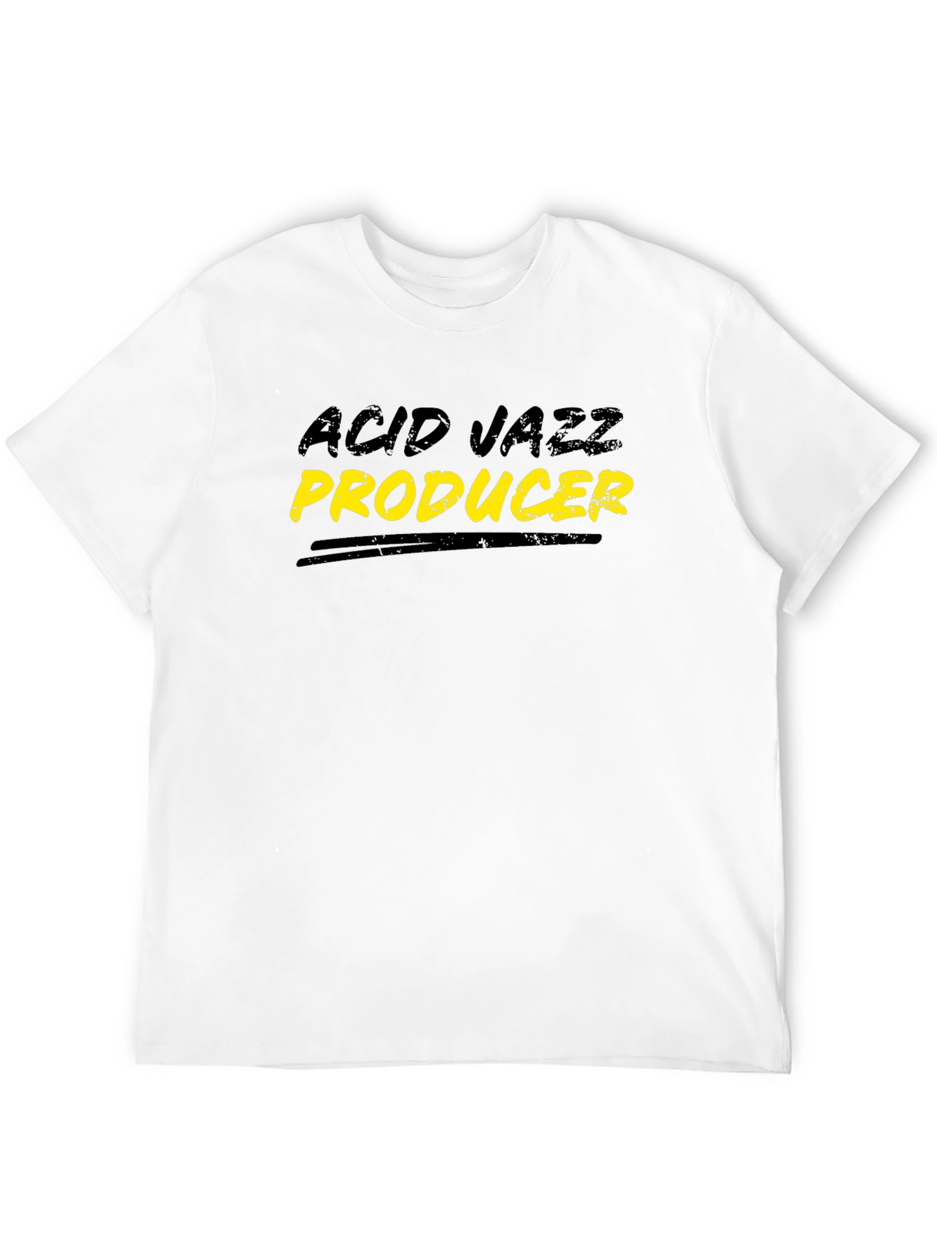 This stylish black t-shirt is perfect for any acid jazz enthusiast. The shirt features the words "ACID JAZZ" in a faded black font and "PRODUCER" in vibrant yellow with a distressed, retro feel. A black line underlines the word Producer. Made from a soft, breathable fabric, this tee offers both comfort and durability for everyday wear. Showcase your love for music with this unique and eye-catching design. Whether you're hitting the studio, attending a concert, or just relaxing, this t-shirt is sure to make a statement. A must-have addition to any musician's wardrobe.