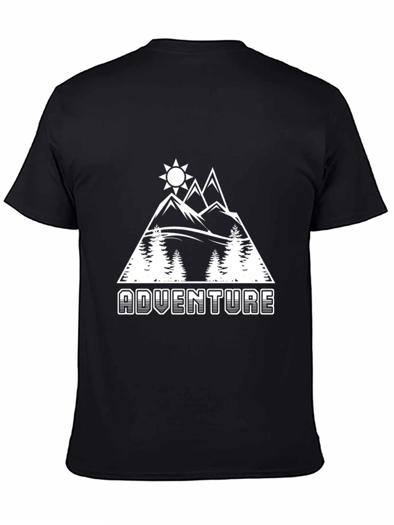 Embrace your adventurous spirit with this stylish black graphic tee. Featuring a striking white design of mountains, trees, and a radiant sun, accompanied by the word "ADVENTURE," this shirt is perfect for outdoor enthusiasts. The classic crew neck and short sleeves offer a comfortable fit, making it ideal for everyday wear or your next hiking excursion. Show off your love for nature and exploration with this eye-catching tee. Made from soft, breathable fabric for ultimate comfort. A great gift for the adventurer in your life!