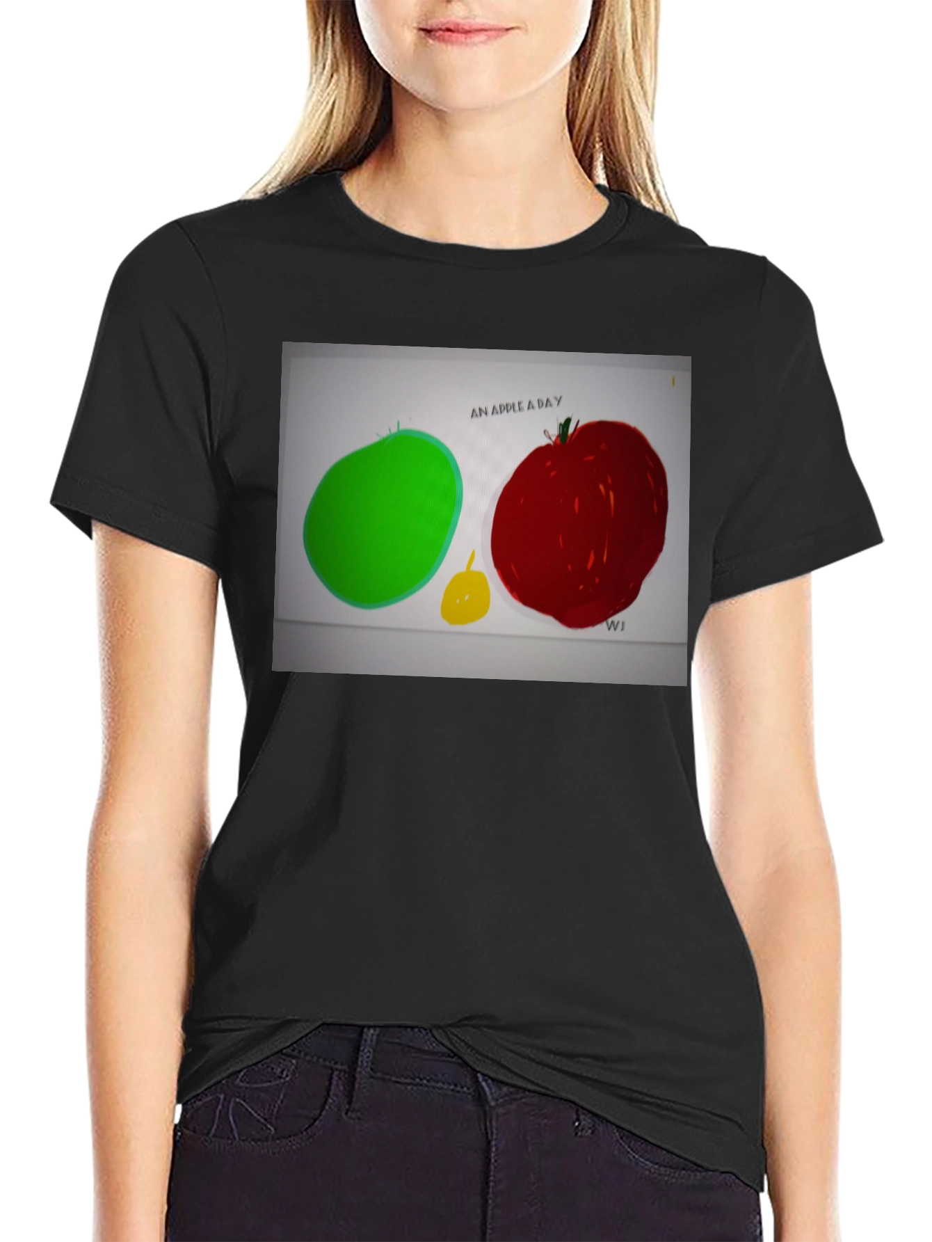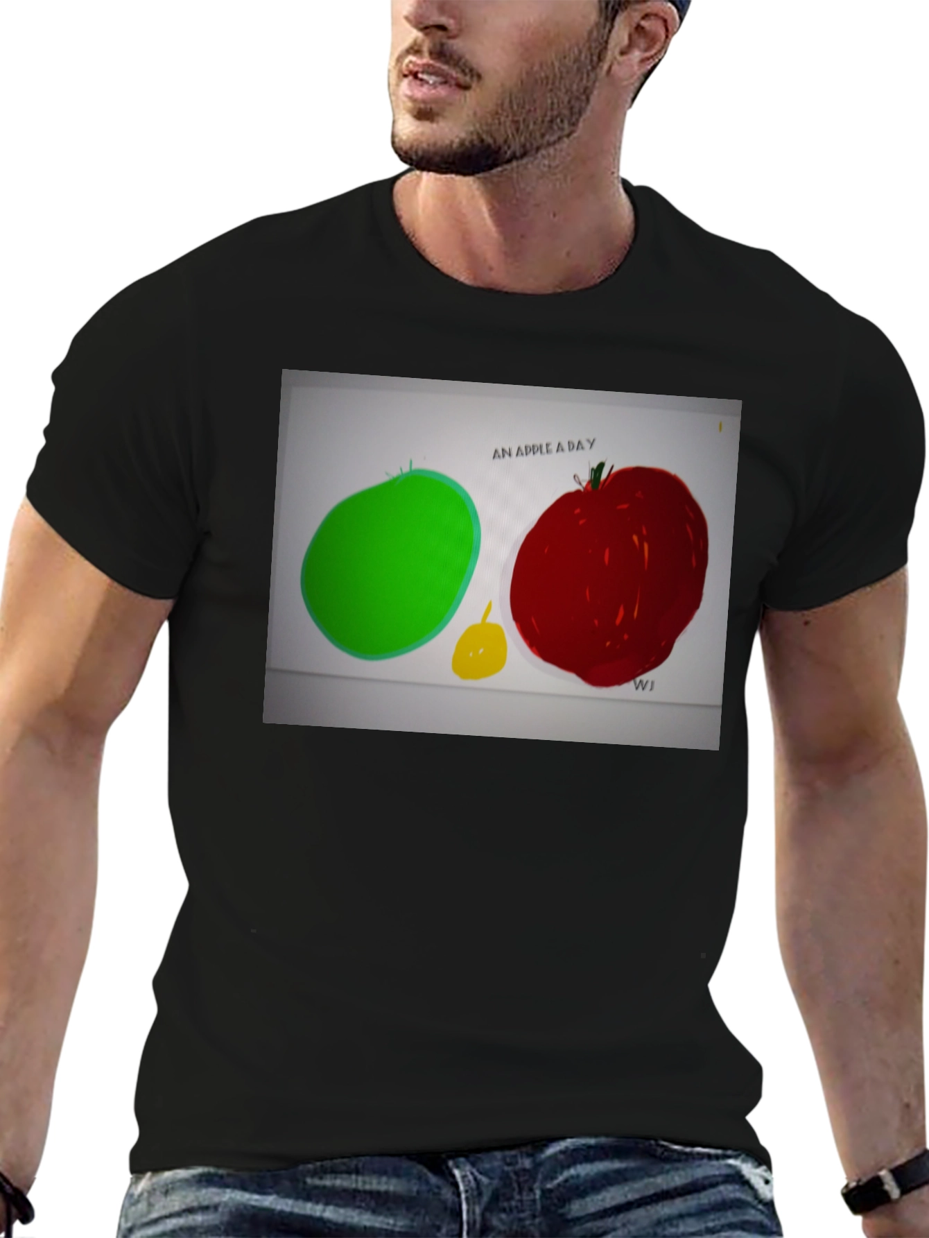 Show off your healthy lifestyle with this unique t-shirt featuring a colorful apple design. The shirt showcases an 'An Apple A Day' graphic with a green and red apple that will catch the eye. Made from comfortable fabric, this tee is perfect for casual wear, workouts, or as a fun conversation starter. The classic black background ensures it pairs well with any outfit. Get yours today and spread the health message with a touch of humor!