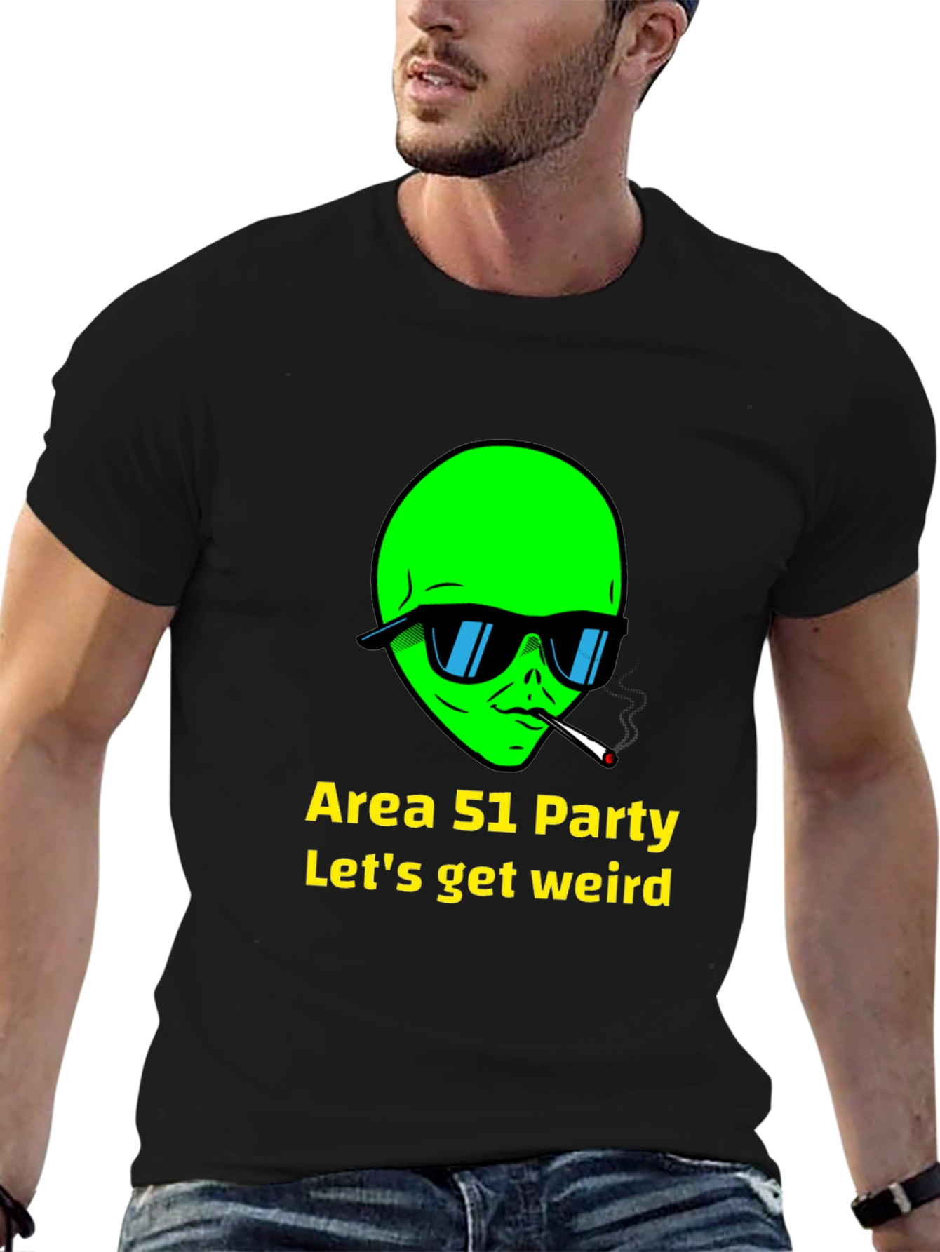 Get ready to party in style with this unique black t-shirt featuring a green alien graphic. This eye-catching design showcases an alien head wearing sunglasses and smoking, paired with the playful text "Area 51 Party - Let's get weird". Made from a comfortable-looking fabric, this tee is perfect for casual wear, parties, or showing off your quirky side. Stand out from the crowd with this fun and conversation-starting piece. Ideal for sci-fi enthusiasts, party-goers, or anyone who loves to embrace the unconventional, this t-shirt is sure to become a wardrobe favorite.