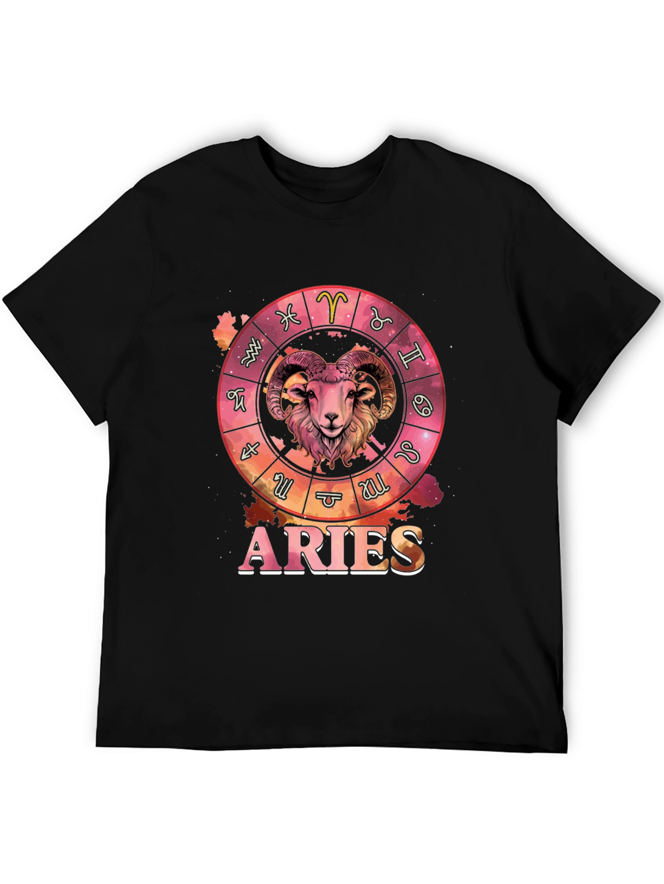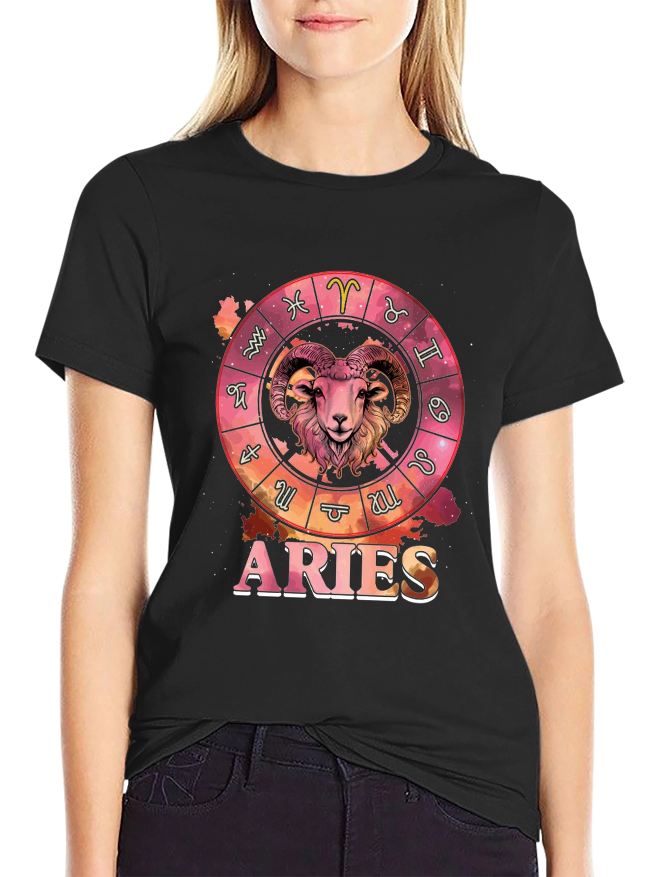Show off your zodiac pride with this unique Aries graphic tee. The black t-shirt features a vibrant, colorful design showcasing the Aries zodiac symbol and a detailed ram illustration encircled by astrological signs. The word "Aries" is emblazoned in a bold font at the bottom of the design. Made from a soft and comfortable fabric, this tee is perfect for everyday wear. Express your personality and astrological identity with this standout piece. It's ideal for casual outings, astrology enthusiasts, or as a thoughtful gift for the Aries in your life.