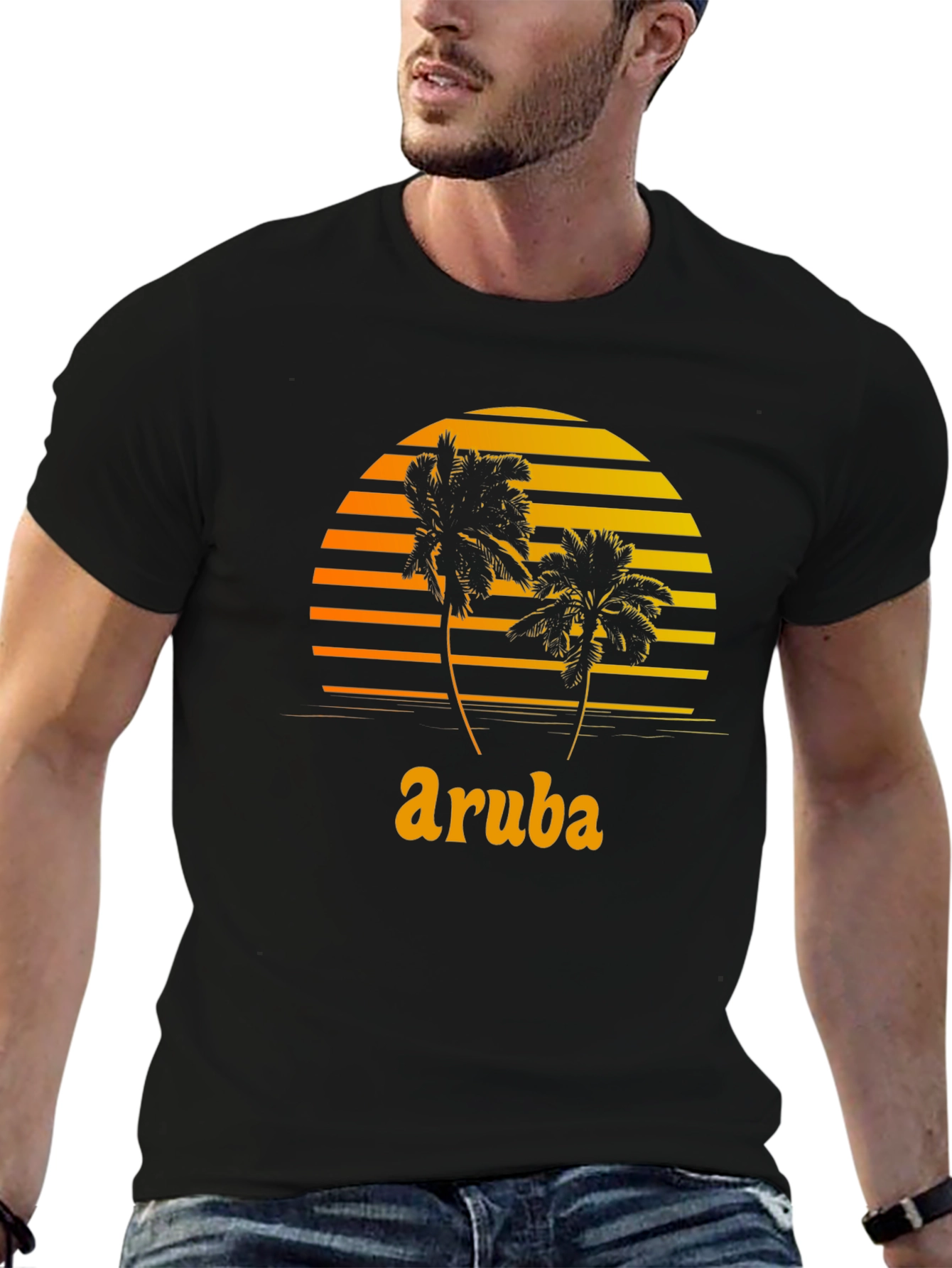 Embrace the island vibes with this stylish black t-shirt featuring a vibrant 'Aruba' sunset graphic. The design showcases silhouetted palm trees against a gradient orange and yellow sun, creating a tropical, laid-back feel. Made from what appears to be soft, comfortable cotton or a cotton blend, this tee is perfect for casual wear, vacations, or everyday style. The classic fit makes it a versatile addition to any wardrobe. Show off your love for Aruba with this eye-catching and comfortable t-shirt, ideal for beach lovers and travel enthusiasts alike. Get yours today and bring the spirit of the Caribbean to your wardrobe!