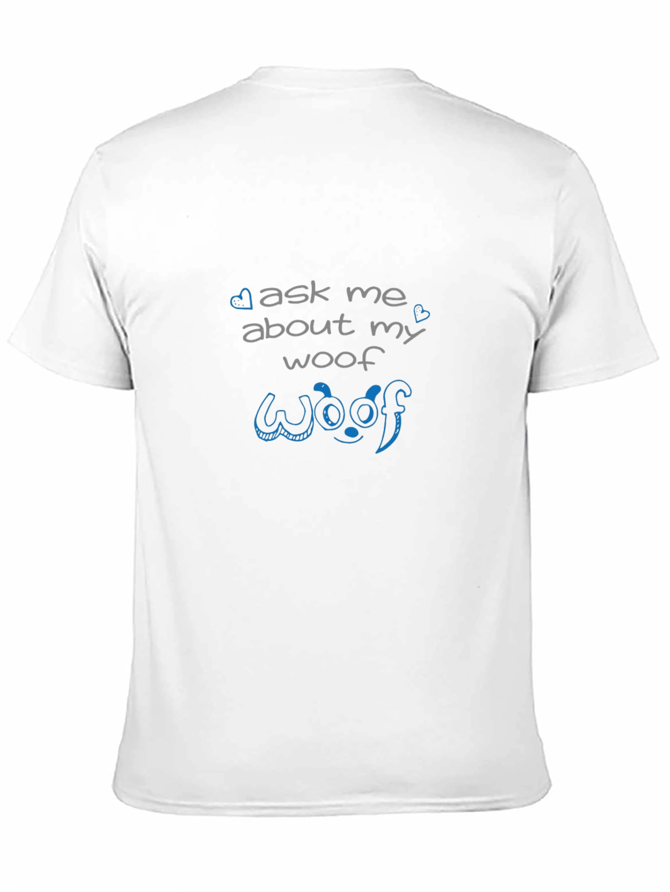 This classic black t-shirt features a playful, eye-catching design that is sure to spark conversations. The shirt prominently displays the phrase "ask me about my woof" in a whimsical font, adorned with charming blue heart and dog-themed accents. Crafted from a soft, breathable fabric, this shirt offers all-day comfort and effortless style. The versatile design makes it perfect for casual outings, dog park visits, or simply lounging at home. Express your love for dogs and showcase your fun personality with this unique and comfortable t-shirt. A must-have for any dog lover's wardrobe!