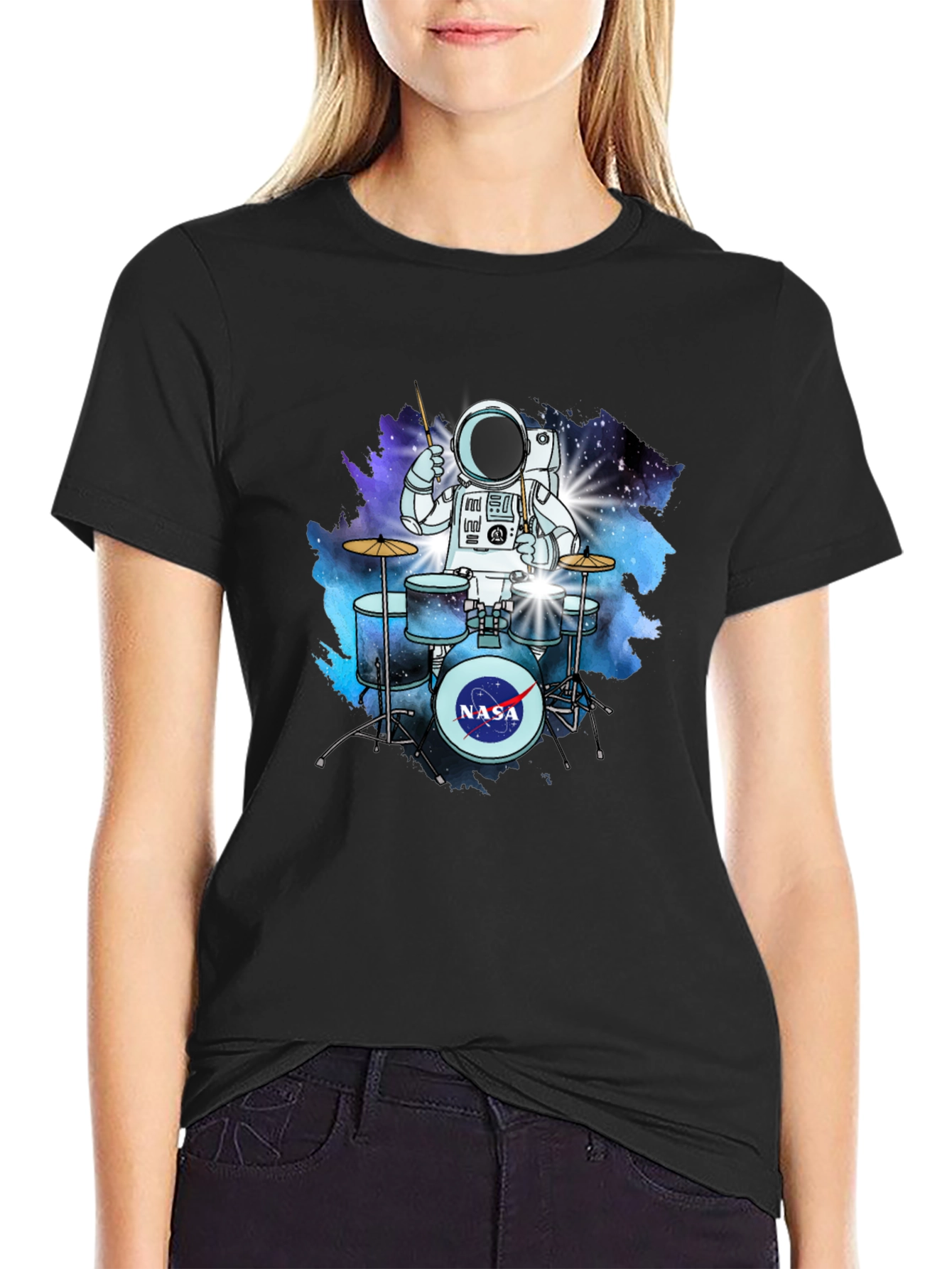 Show off your love for space and music with this unique t-shirt. Featuring an astronaut playing the drums with a NASA logo on the drum, this shirt is perfect for anyone who dreams of exploring the cosmos. The design is printed on a comfortable, black fabric, making it ideal for casual wear. Whether you're a drummer, a space enthusiast, or just looking for a cool tee, this shirt is sure to turn heads. Great for concerts, space events, or everyday wear. Order yours today and let your passion shine!
