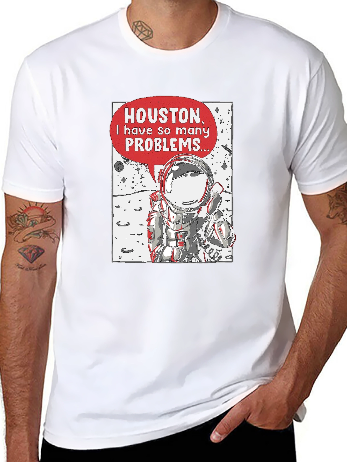 This black t-shirt features a unique graphic of an astronaut on a lunar surface. The design includes a speech bubble stating "Houston, I have so many problems...", adding a touch of humor. Made from a comfortable fabric, this tee is perfect for casual wear. The graphic print is eye-catching, making it a great conversation starter. Wear it to express your fun side or as a statement piece. This unique shirt is sure to be a hit. Ideal for everyday wear, space enthusiasts, or anyone who enjoys a quirky graphic tee.
