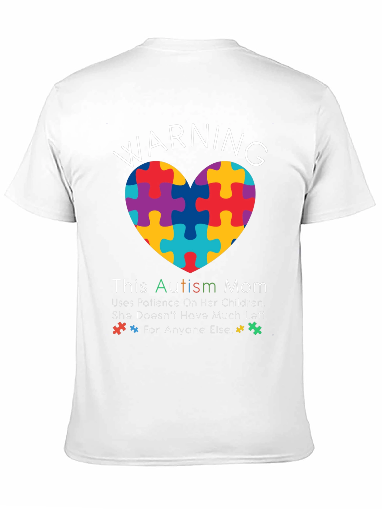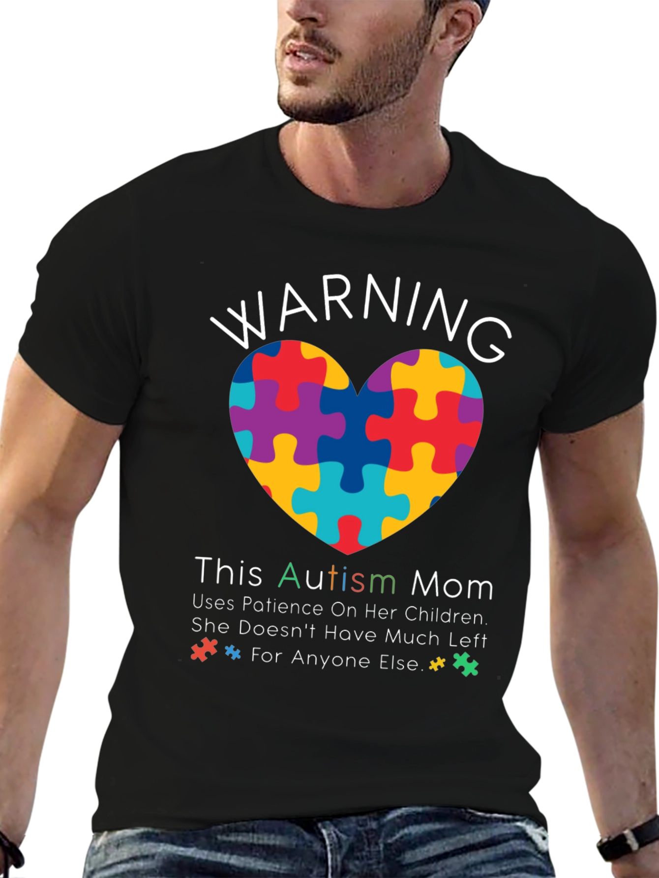 This black t-shirt features a vibrant, heart-shaped puzzle design, symbolizing autism awareness. Above the heart, the word "WARNING" is boldly displayed. Below, the text "This Autism Mom Uses Patience On Her Children. She Doesn't Have Much Left * For Anyone Else.* " is printed in a combination of fonts and colors, adding a playful touch. The shirt is made from a comfortable-looking fabric, making it perfect for everyday wear and showing support for autism awareness.