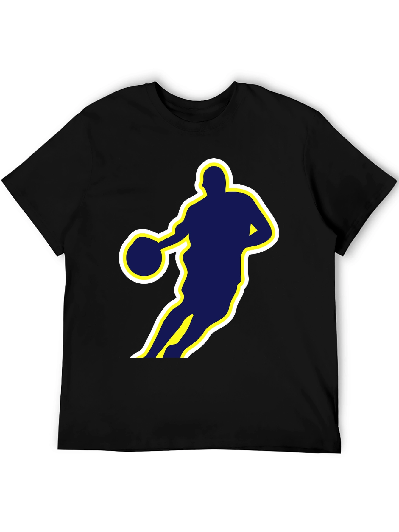 Show your love for the game with this stylish basketball graphic tee. Featuring a dynamic silhouette of a basketball player dribbling, this t-shirt is perfect for athletes and fans alike. The design is rendered in contrasting colors, making it pop against the tee's dark backdrop. Made from a comfortable, breathable fabric, this shirt is ideal for everyday wear, workouts, or cheering on your favorite team. It's a casual yet eye-catching piece that showcases your passion for basketball. A perfect gift for basketball enthusiasts.