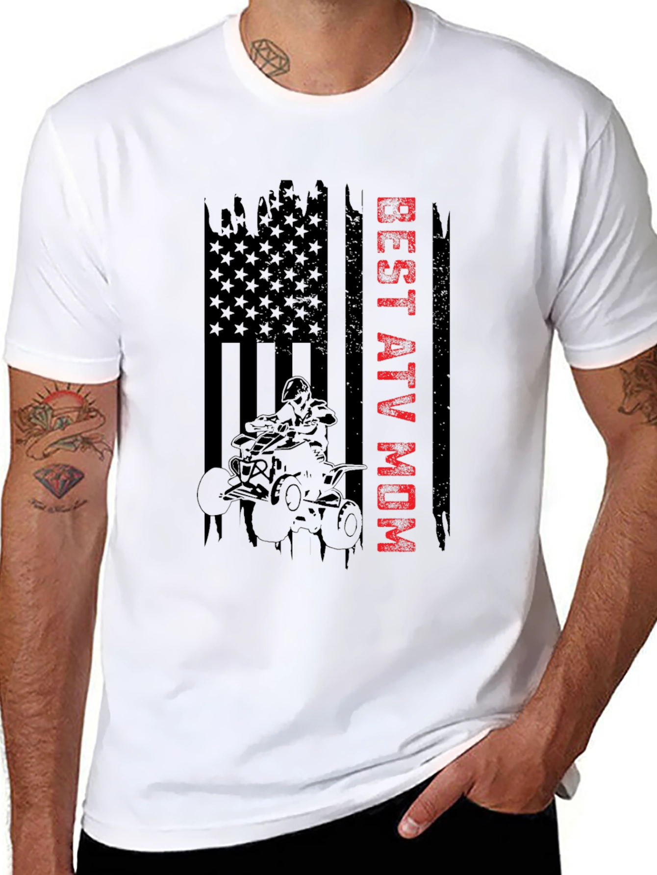 Show off your love for ATV riding with this unique "Best ATV Mom" t-shirt. Featuring a distressed American flag design, overlaid with an ATV graphic, this black tee is perfect for the adventurous mom. The bold, red lettering adds a touch of style. Made from comfortable, breathable fabric, it's ideal for casual wear, outdoor activities, or a day at the races. Get yours today and let everyone know who the best ATV mom is!