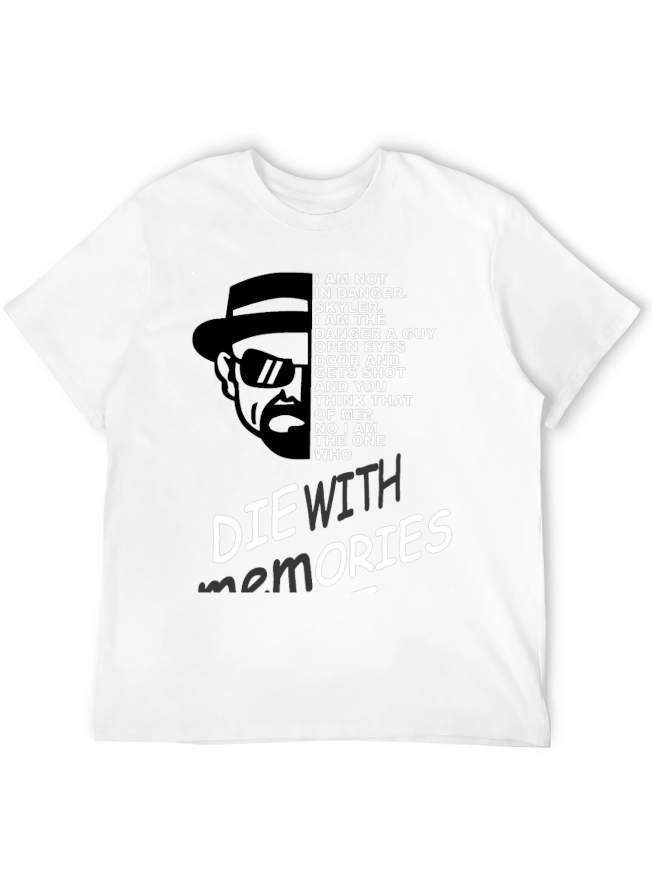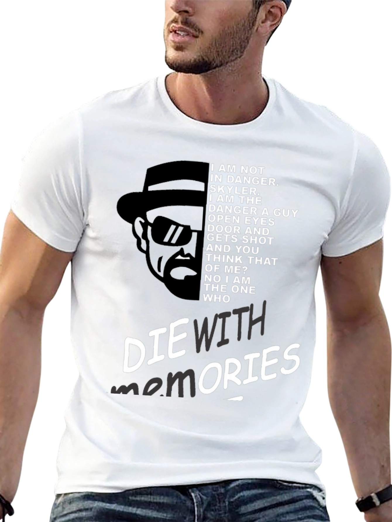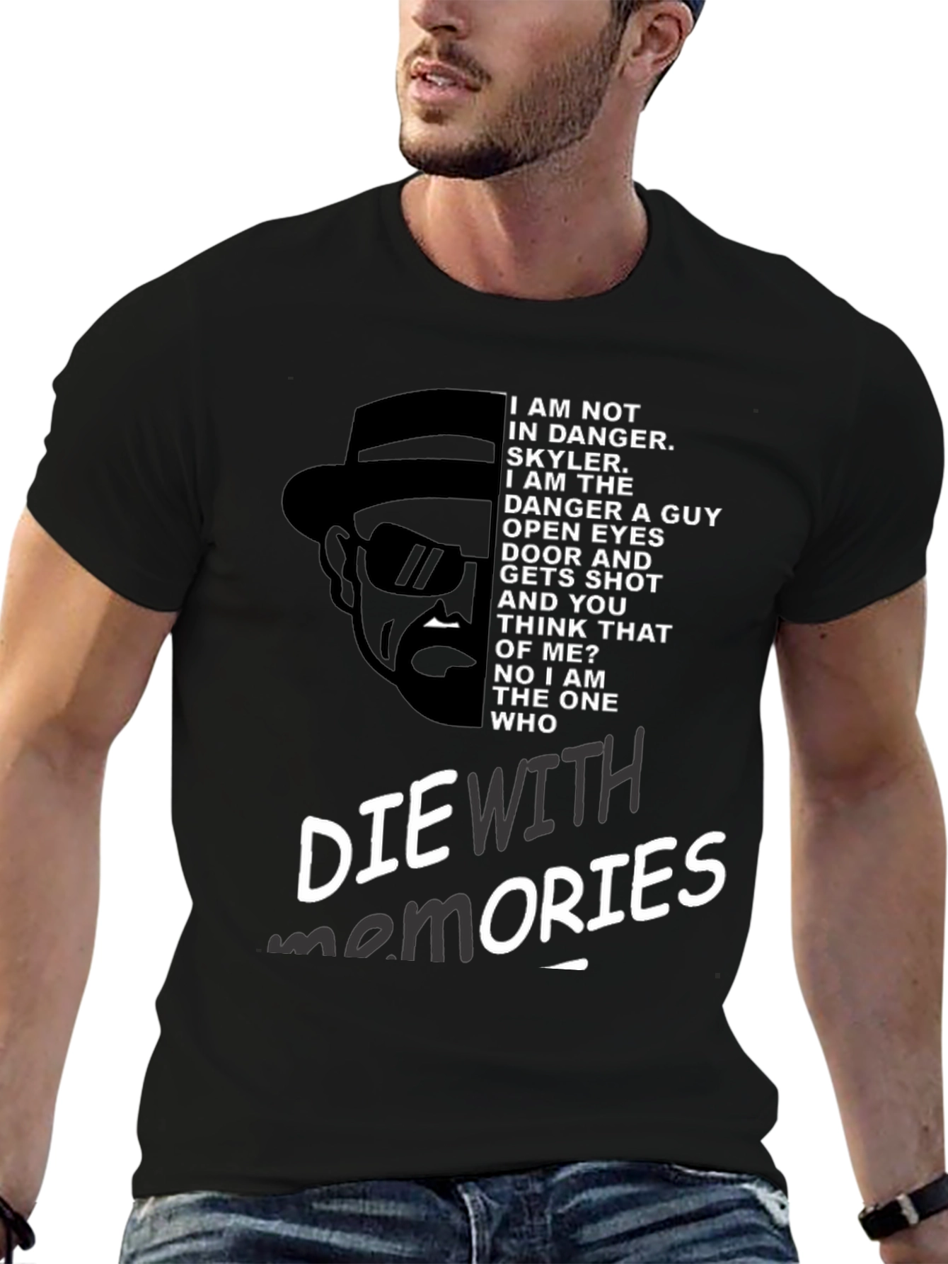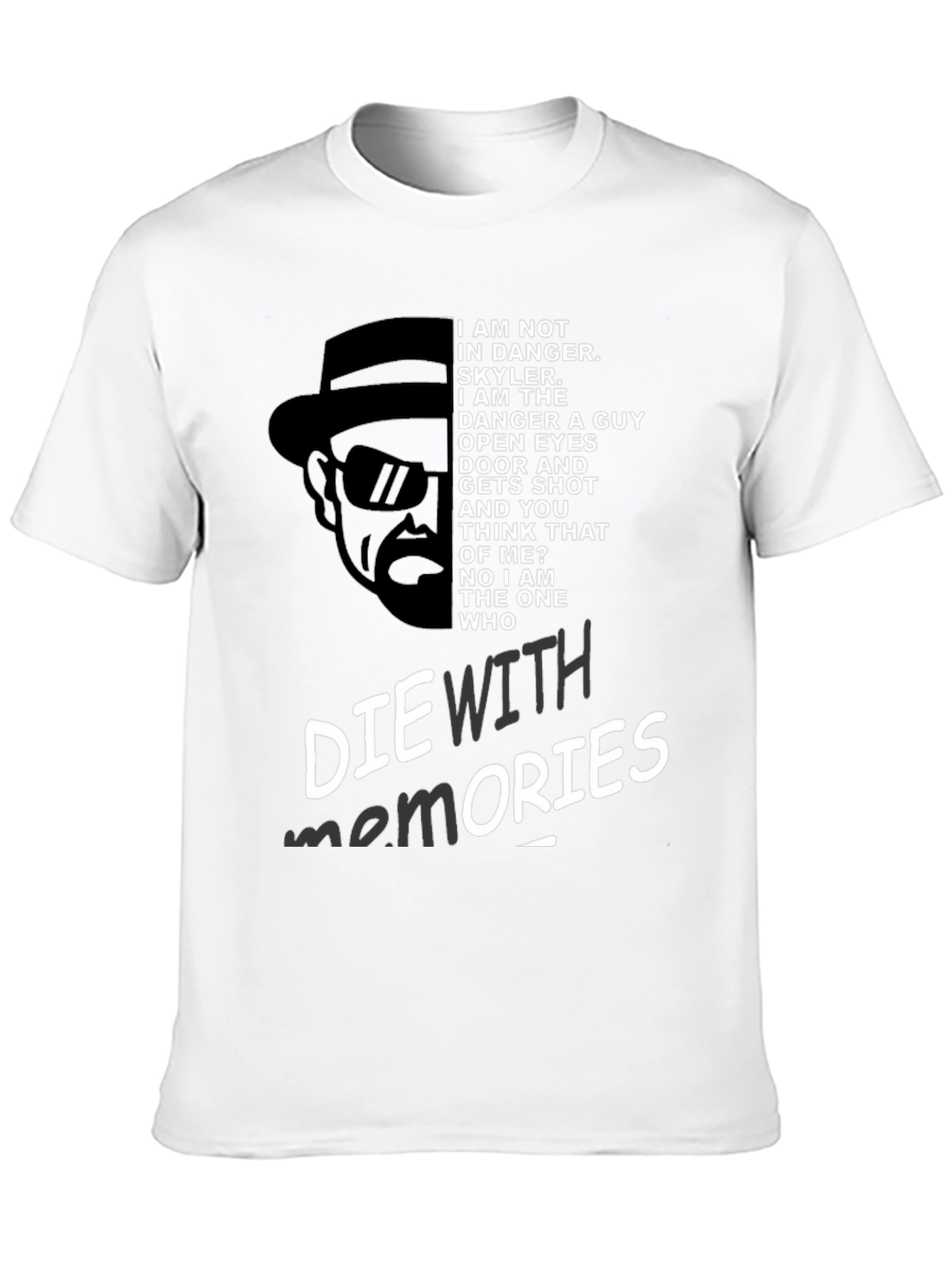 Show off your love for Breaking Bad with this striking black graphic tee. The shirt features a bold design incorporating the iconic image of Walter White along with memorable quotes from the show, rendered in a clean, white font. The phrase "Die With Memories" is prominently displayed, adding a touch of edgy style. Made from what appears to be soft, breathable cotton blend, this tee offers both comfort and durability. It's a perfect conversation starter, ideal for casual outings, fan conventions, or binge-watching your favorite episodes. Make a statement and express your fandom with this unique and eye-catching t-shirt.