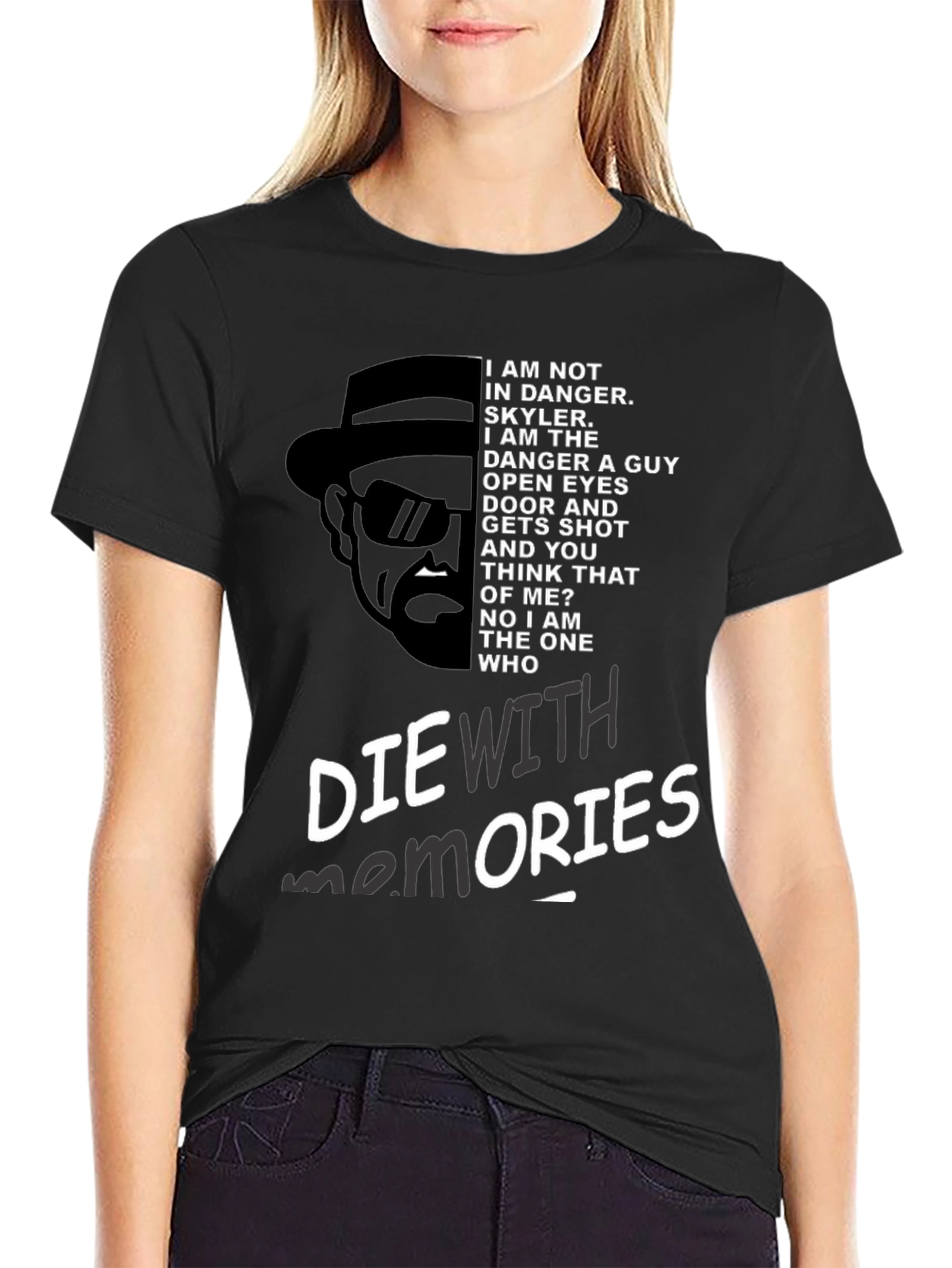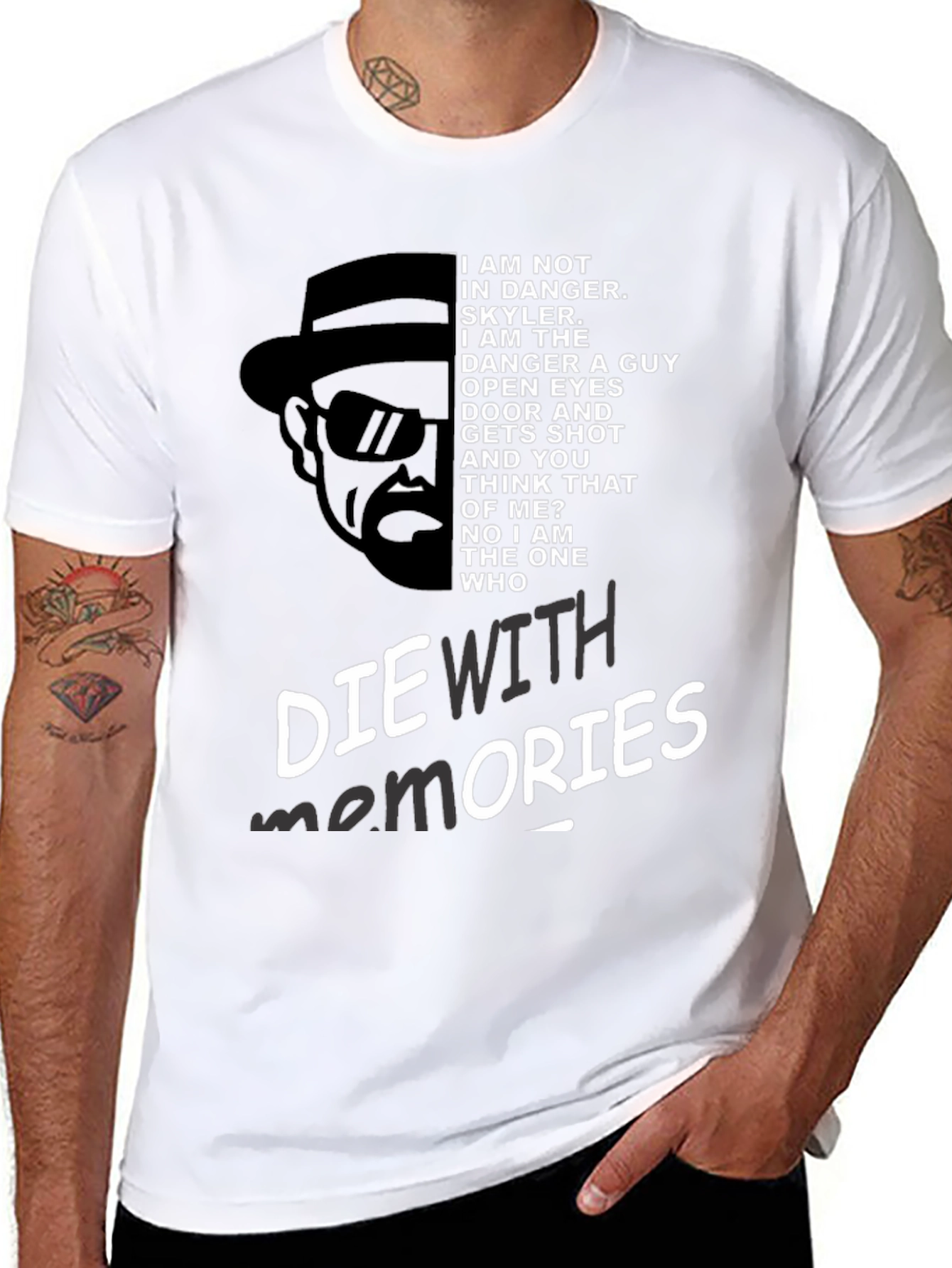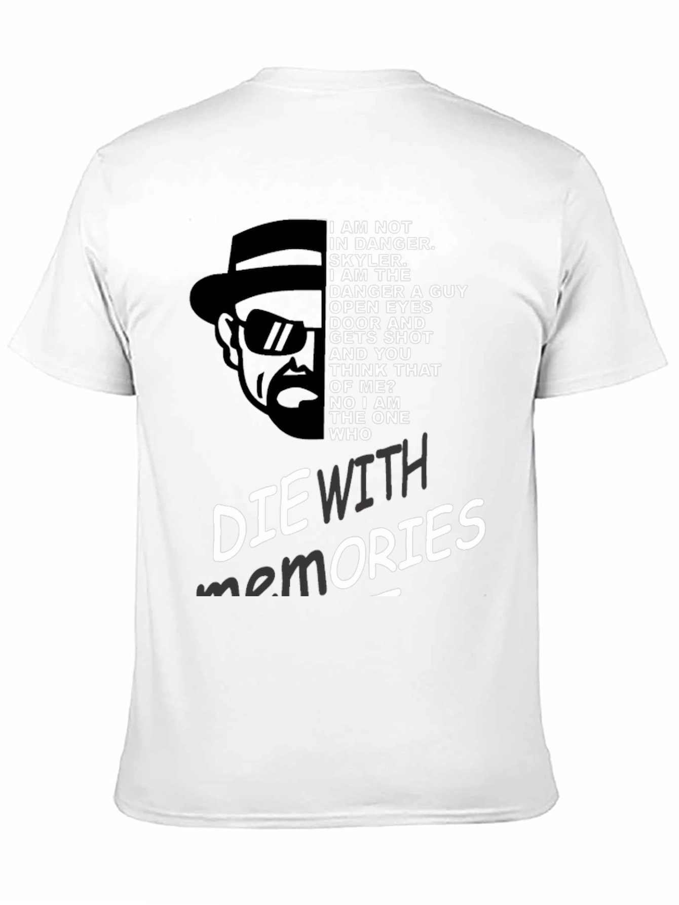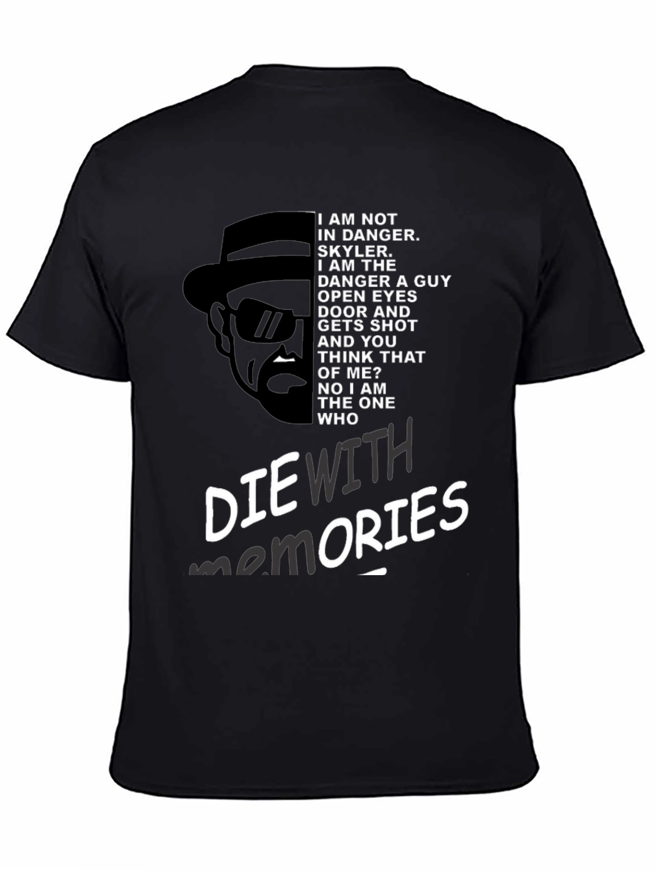 Show off your love for Breaking Bad with this striking black graphic tee. The shirt features a bold design incorporating the iconic image of Walter White along with memorable quotes from the show, rendered in a clean, white font. The phrase "Die With Memories" is prominently displayed, adding a touch of edgy style. Made from what appears to be soft, breathable cotton blend, this tee offers both comfort and durability. It's a perfect conversation starter, ideal for casual outings, fan conventions, or binge-watching your favorite episodes. Make a statement and express your fandom with this unique and eye-catching t-shirt.