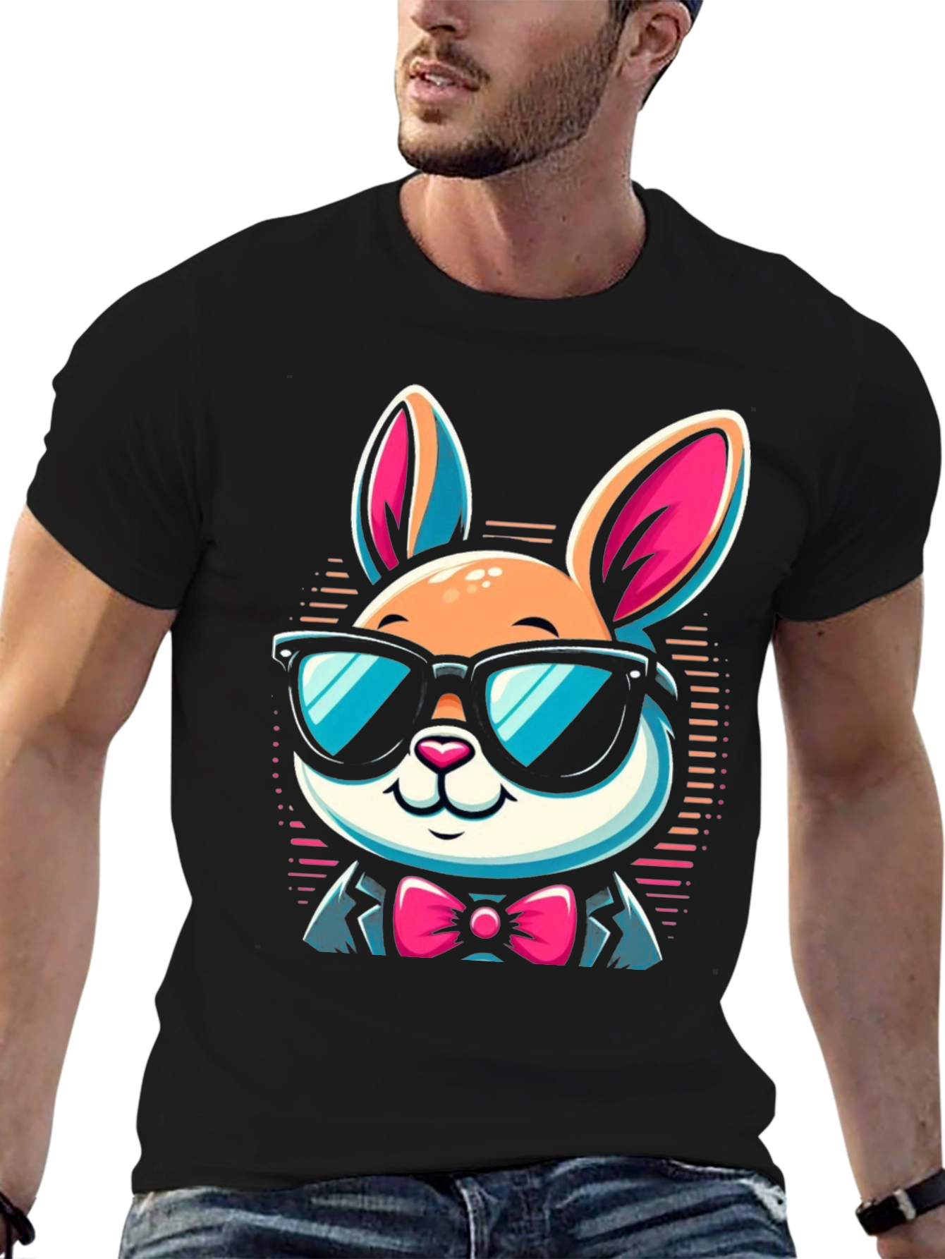 Show off your playful side with this stylish black t-shirt featuring a cool rabbit graphic. The design showcases a cartoon bunny wearing sunglasses and a bow tie, exuding a fun and trendy vibe. Made from a comfortable fabric, this tee is perfect for casual wear, parties, or as a unique gift for bunny lovers. Stand out from the crowd with this eye-catching and humorous t-shirt that combines comfort and personality. Whether you're dressing up or down, this tee is sure to add a touch of fun to any outfit. Get yours today and hop into style!