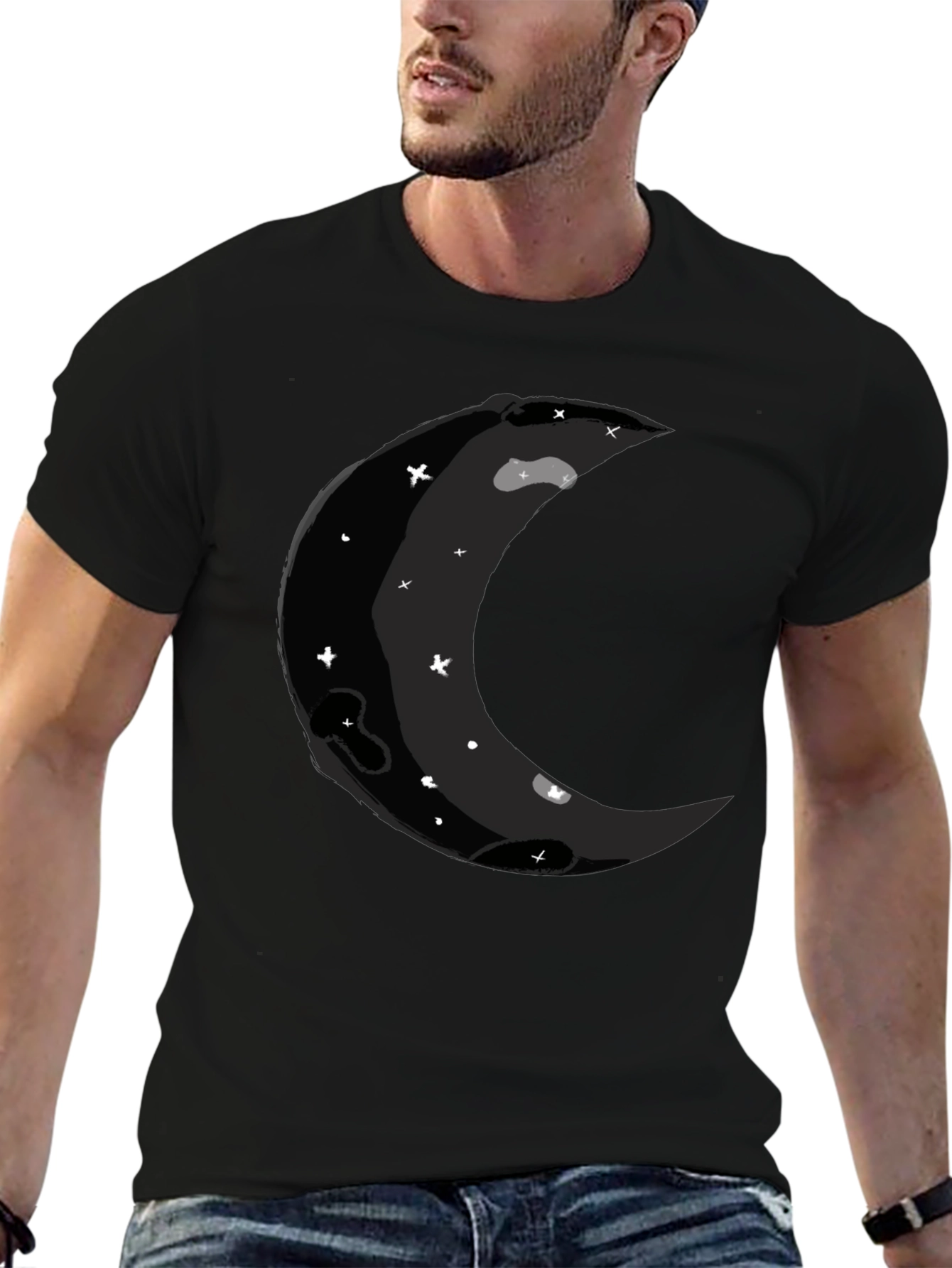Embrace the night with this stylish black t-shirt featuring a unique crescent moon graphic. The moon design showcases various shades of gray, accented with subtle star-like details, creating a captivating visual contrast against the dark fabric. Made from comfortable materials, this t-shirt offers a soft and breathable fit, perfect for everyday wear. Ideal for casual outings, night-time events, or simply lounging at home, this t-shirt allows you to express your individual style. Pair it with jeans or shorts for a cool and effortless look. Stand out from the crowd with this trendy and eye-catching crescent moon tee.