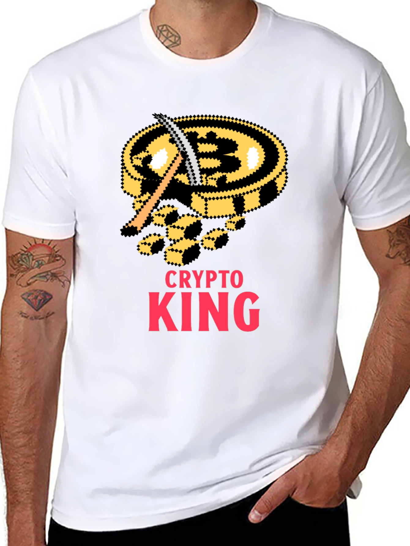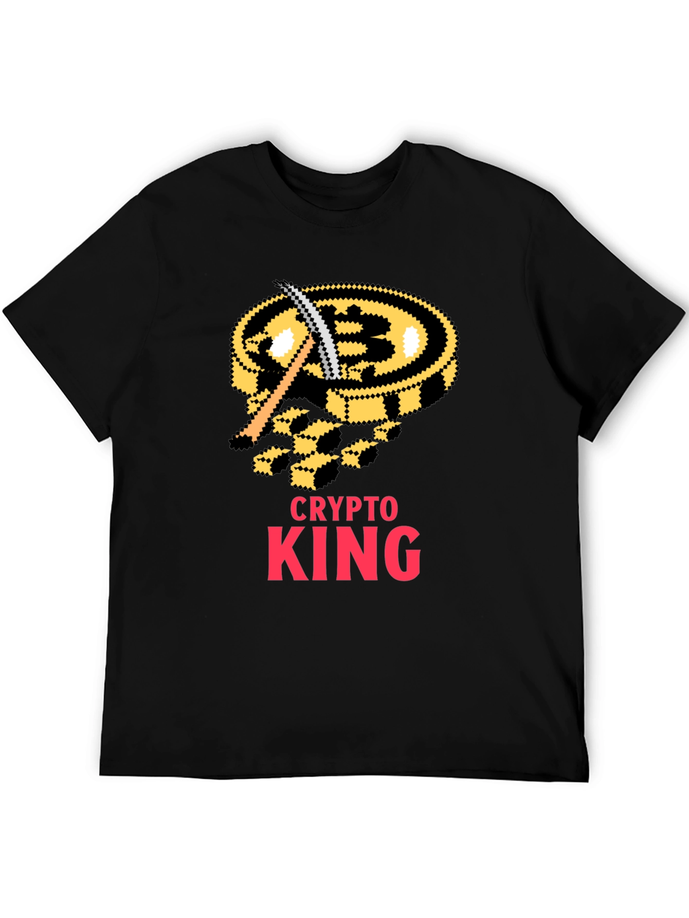 Show your love for cryptocurrency with this unique Crypto King t-shirt. This black tee features a pixelated Bitcoin design with a mining pickaxe, perfect for crypto enthusiasts. The bold "CRYPTO KING" text adds a touch of royalty to your wardrobe. Made from a comfortable, breathable fabric, this t-shirt is ideal for everyday wear, crypto conferences, or casual meetups. Make a statement and let everyone know you're a crypto king!