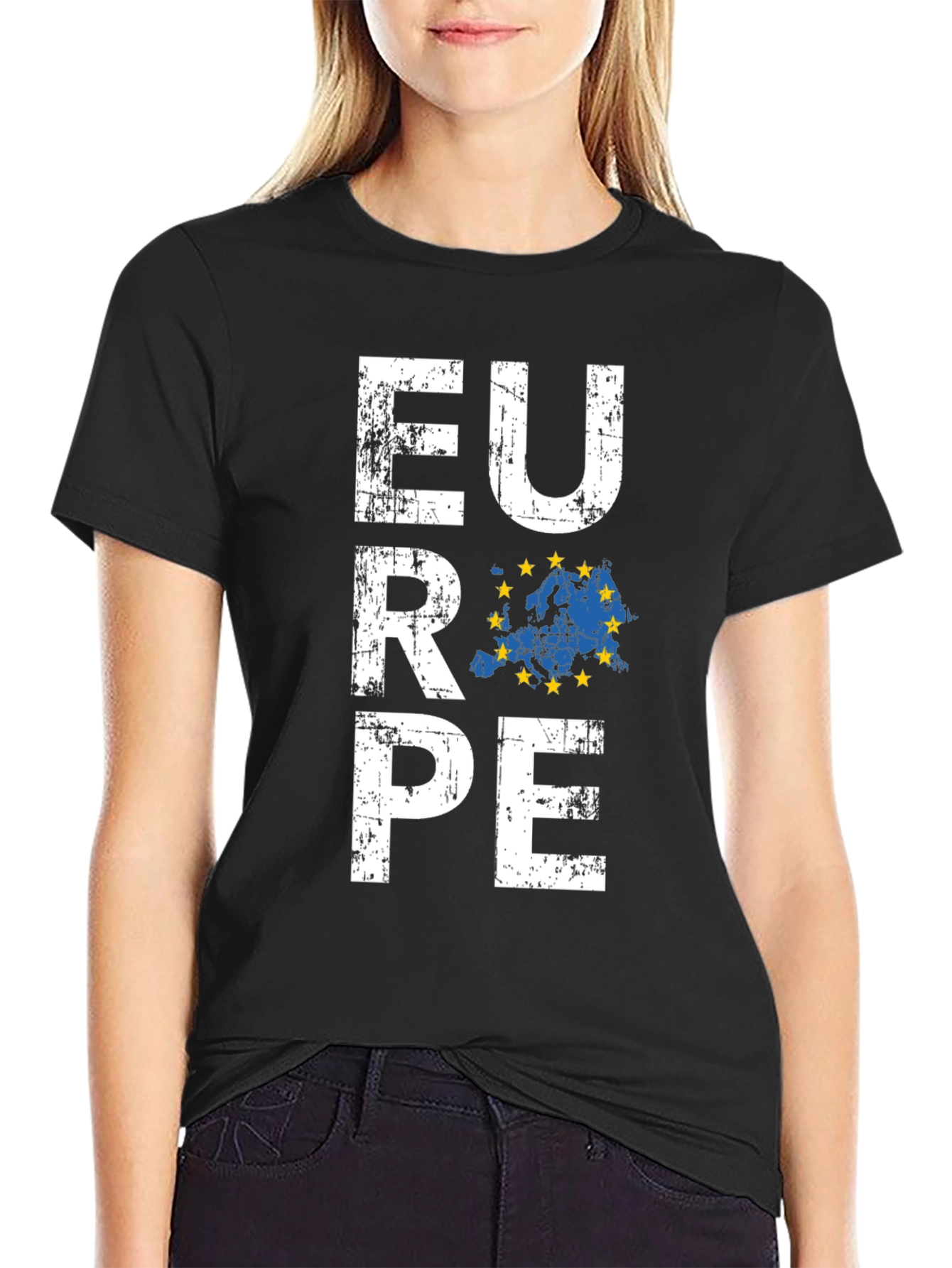 Show your love for Europe with this stylish black graphic tee. Featuring a distressed "EUROPE" print with the EU flag map integrated into the design, this t-shirt is perfect for travel enthusiasts and anyone proud of their European heritage. The shirt appears to be made of soft cotton fabric. The distressed print adds a vintage touch, making it a unique and eye-catching piece. Ideal for casual wear, travel, or as a gift for someone who loves Europe.