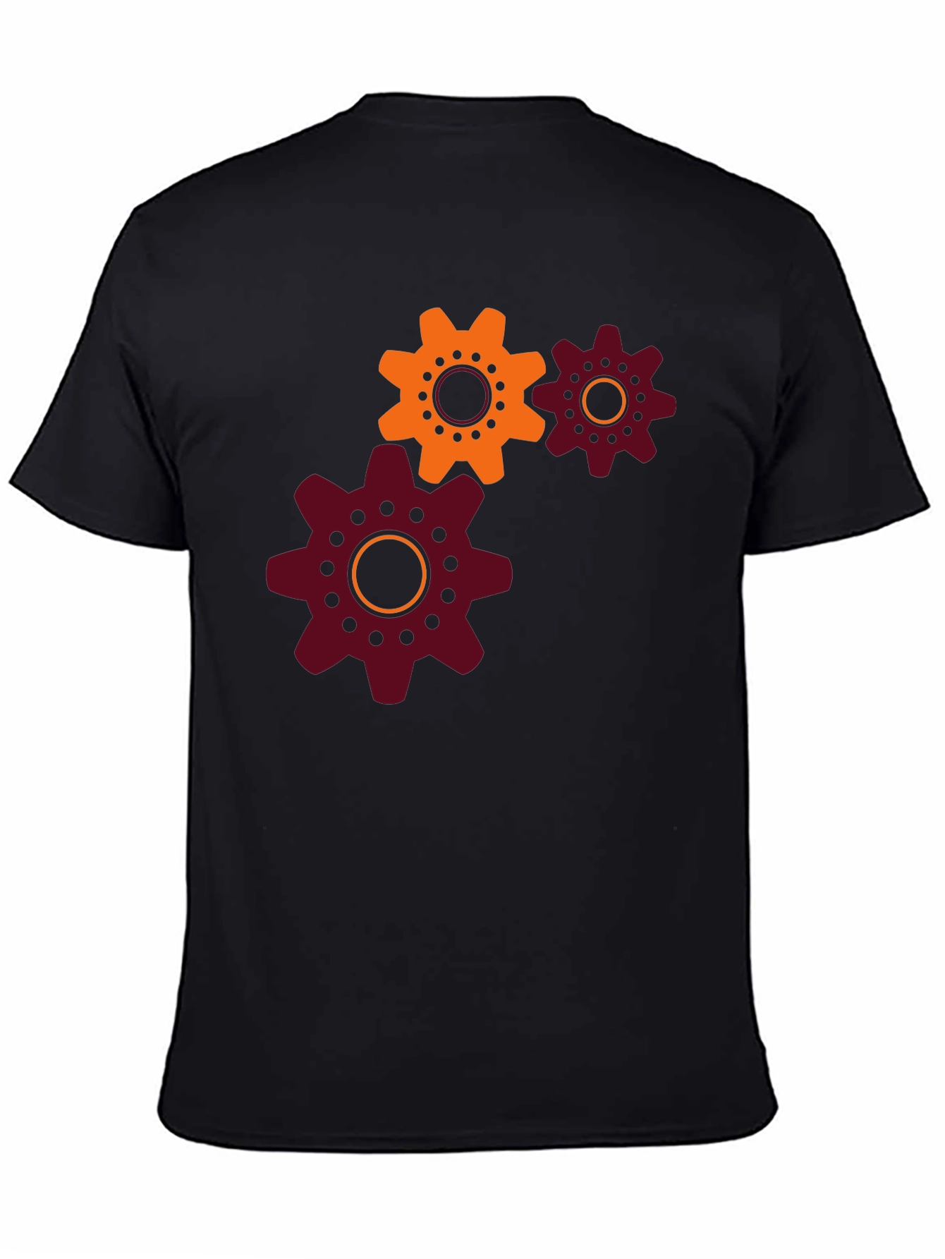 Show off your unique style with this black t-shirt featuring a cool gear design. This eye-catching tee showcases three interlocking gears in orange and maroon shades, adding a touch of mechanical flair to your casual wear. Made from a soft, breathable fabric, this t-shirt offers both comfort and style, making it perfect for everyday wear or a unique statement piece. Whether you're a fan of engineering or simply love distinctive graphics, this gear t-shirt is sure to turn heads and spark conversations. Upgrade your wardrobe with this trendy and comfortable piece!