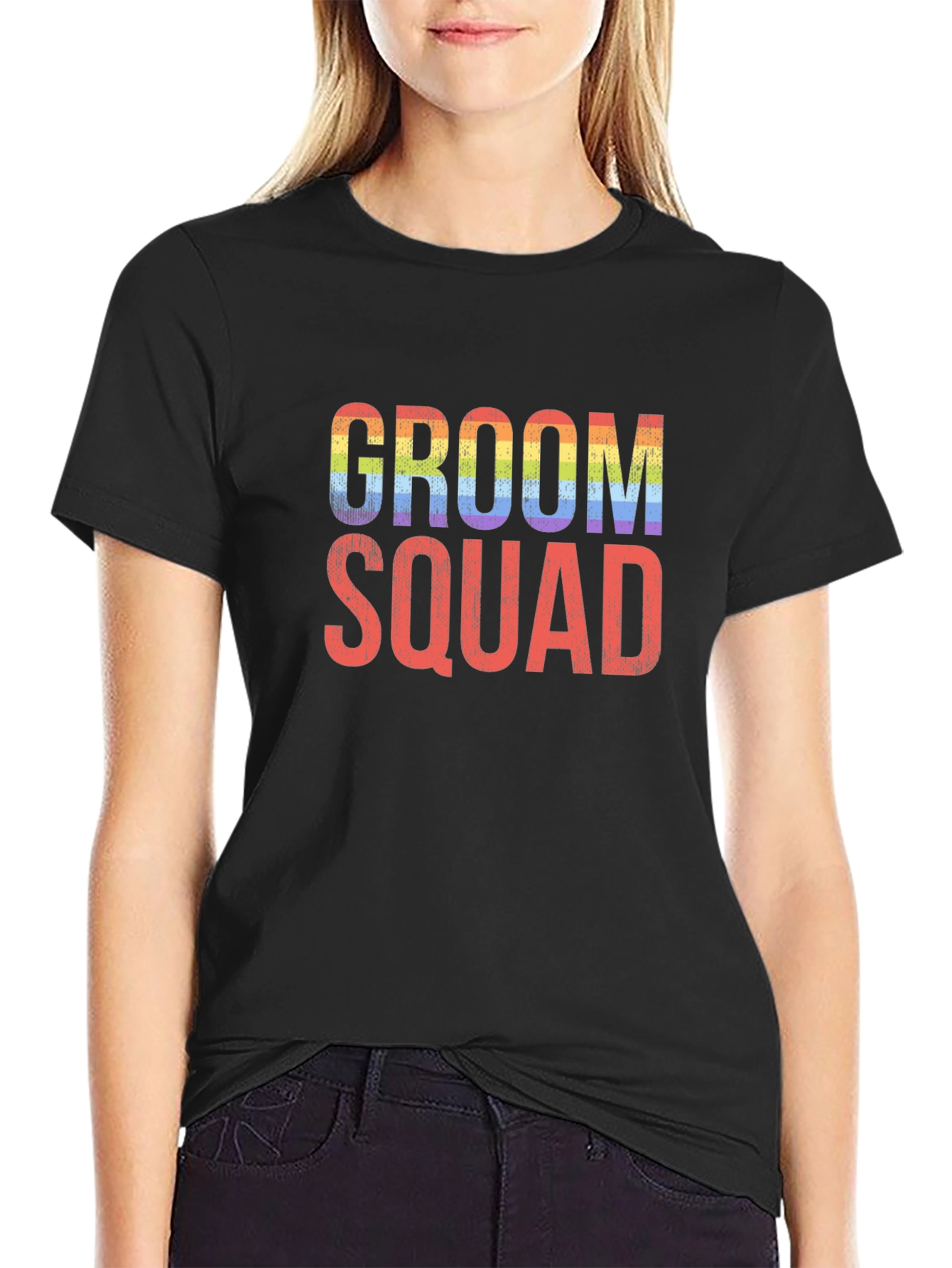 Celebrate love and unity with this eye-catching "Groom Squad" t-shirt. The shirt features a bold, rainbow-colored "GROOM" text above a red "SQUAD" text, expressing support and solidarity. Crafted from a soft, comfortable fabric, this tee is perfect for bachelor parties, wedding celebrations, or everyday wear to showcase your pride. Its classic fit makes it a versatile addition to any wardrobe, while the vibrant colors ensure you stand out in the crowd. Wear it with pride and let everyone know you're part of the groom's awesome team!
