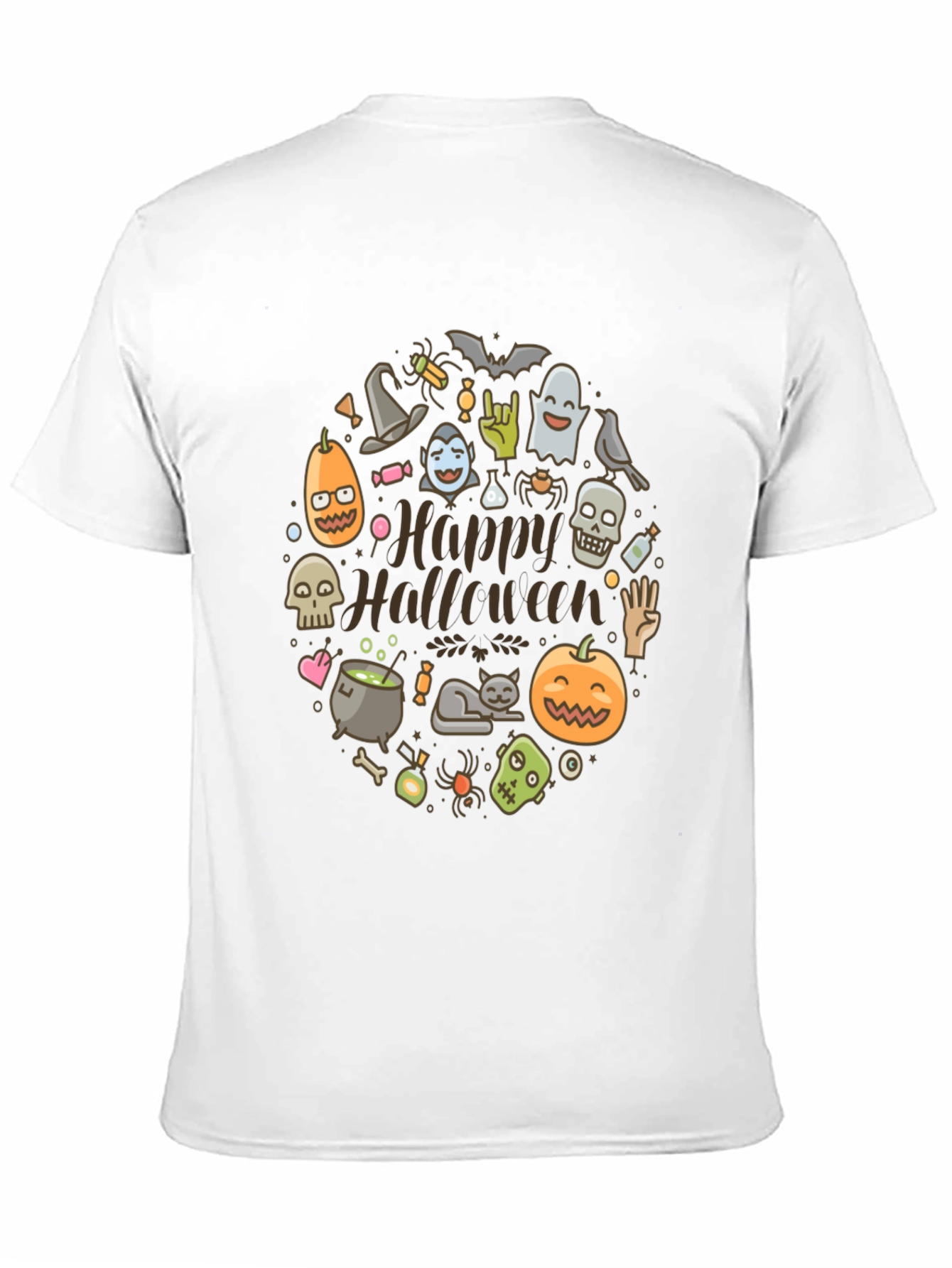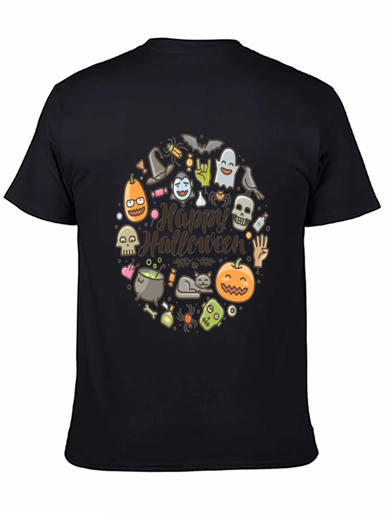 Get ready for spooky season with this fun and festive black t-shirt! The shirt features a colorful circle graphic design filled with Halloween icons like pumpkins, bats, ghosts, and skulls. The phrase "Happy Halloween" is written in a stylish script. Made from a soft, comfortable fabric, this t-shirt is perfect for Halloween parties, trick-or-treating, or everyday wear. Show off your love for Halloween with this eye-catching and unique t-shirt.