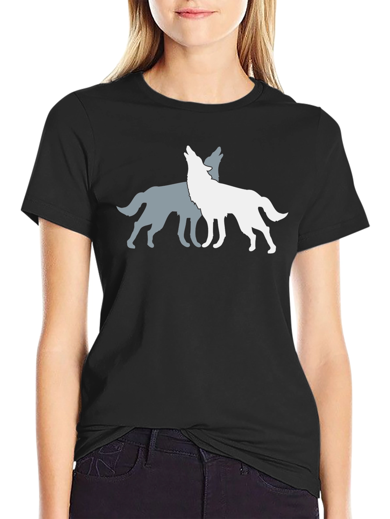 Show off your wild side with this stylish black t-shirt featuring a unique graphic of two wolves howling at the moon. The detailed design showcases one gray wolf and one white wolf, creating a visually striking contrast. Made from comfortable, breathable fabric, this tee is perfect for everyday wear. Ideal for casual outings, concerts, or simply lounging at home, this t-shirt is a versatile addition to any wardrobe. The classic black color makes it easy to pair with jeans, shorts, or joggers. Express your love for wildlife and nature with this eye-catching wolf graphic tee.