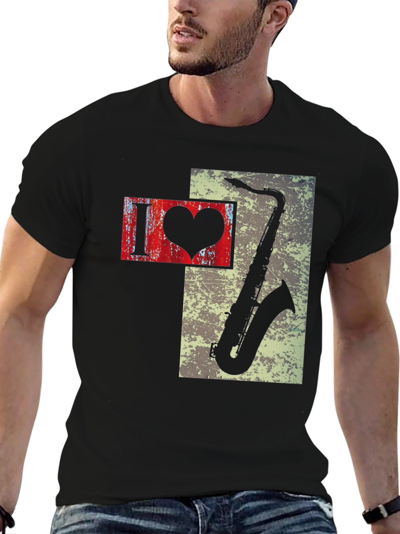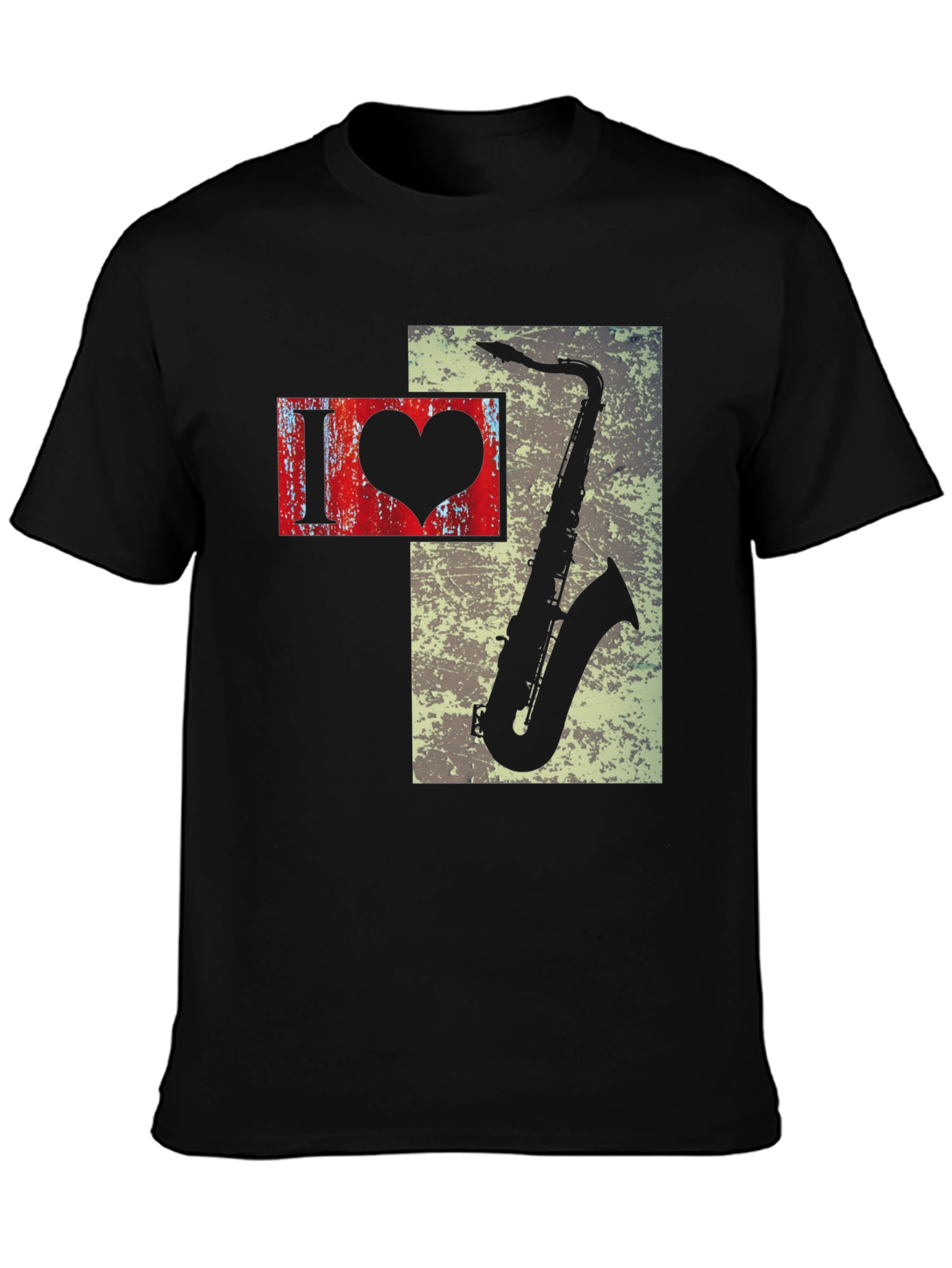 Show your love for music with this stylish men's black tee. This unique shirt features a creative design with an 'I' and a heart symbol next to a saxophone silhouette, all set against a textured backdrop. The combination of graphic elements creates an eye-catching statement piece that's perfect for casual wear. Made from soft, breathable fabric, this tee ensures all-day comfort. Wear it to concerts, music festivals, or as an everyday expression of your passion for music. A great gift for saxophone players and music enthusiasts!