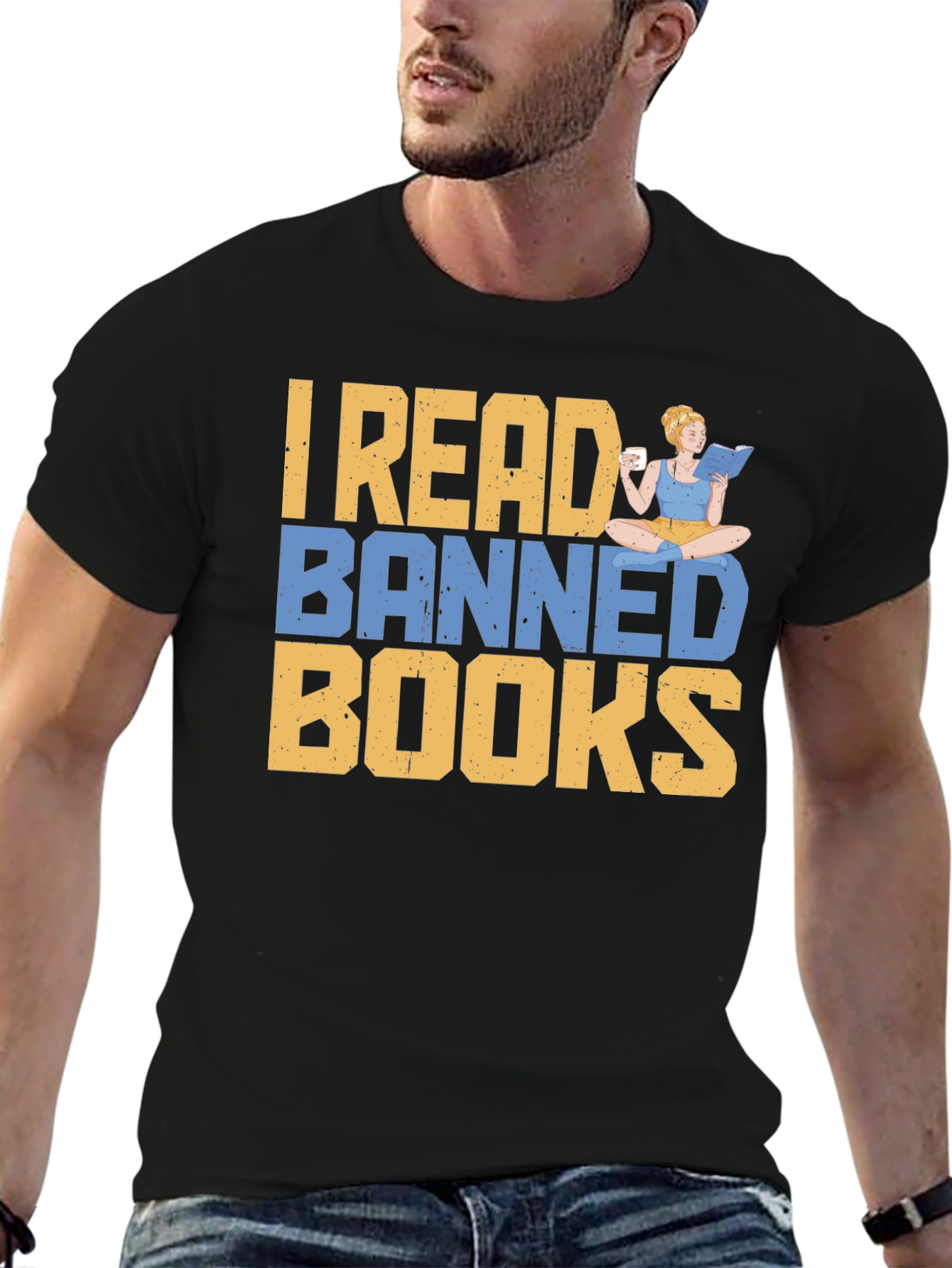 Express your love for literature with this eye-catching graphic tee! The bold design features the phrase "I READ BANNED BOOKS" in a striking, two-tone color scheme. A whimsical graphic of a reader adds a touch of fun. Made from comfortable, breathable fabric, this t-shirt is perfect for everyday wear. Show off your intellectual side and make a statement with this must-have addition to your wardrobe. Ideal for book lovers, students, and anyone who appreciates a good read. Get yours today and let the world know you support intellectual freedom!