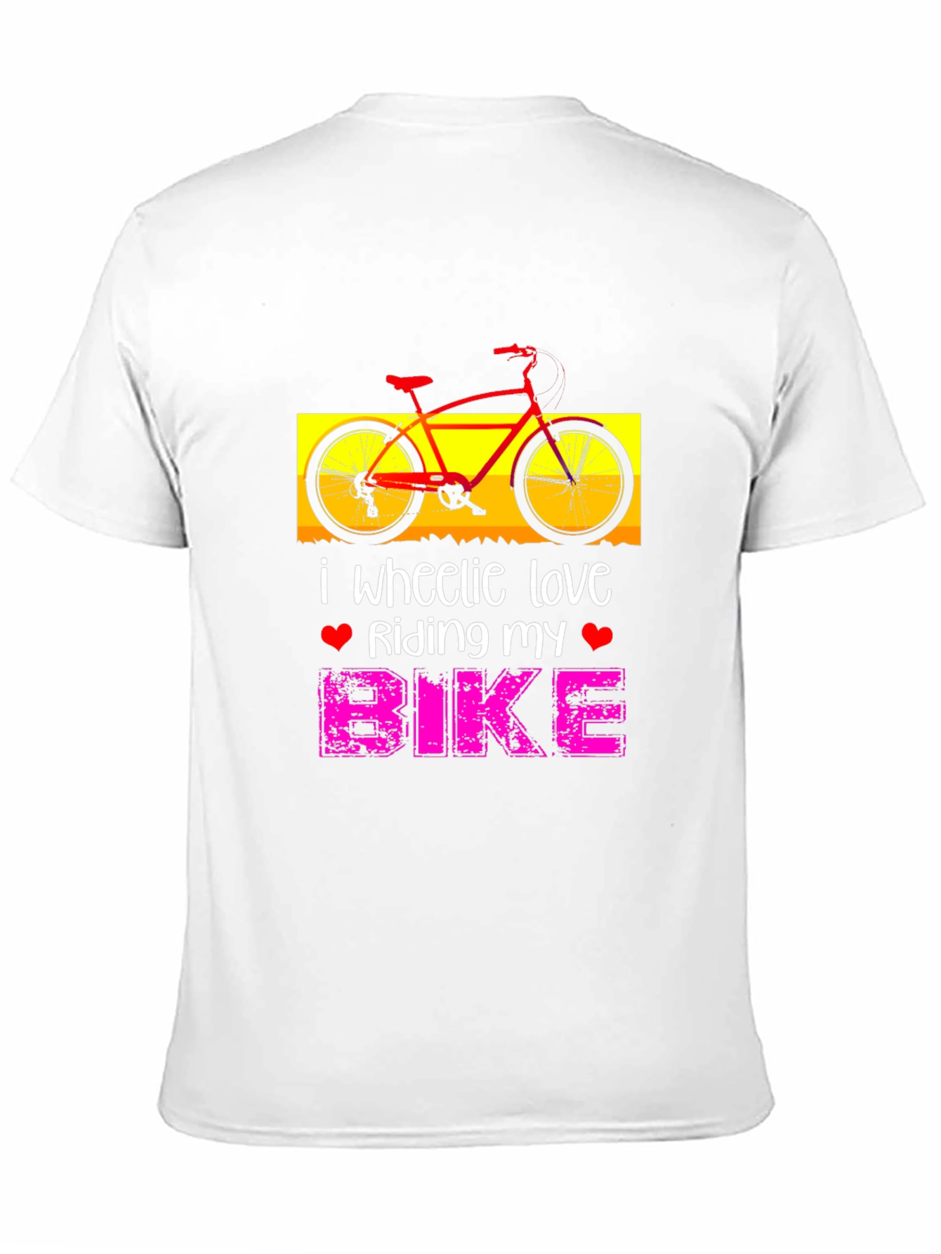 Show your love for cycling with this eye-catching black graphic t-shirt! Featuring a vibrant red bicycle set against a yellow backdrop, this tee also boasts a playful "I wheelie love riding my bike" slogan in white and pink fonts. The design is sure to turn heads. Made from a comfortable fabric, it's perfect for everyday wear, bike rides, or casual outings. A fun and stylish way to express your passion for biking.