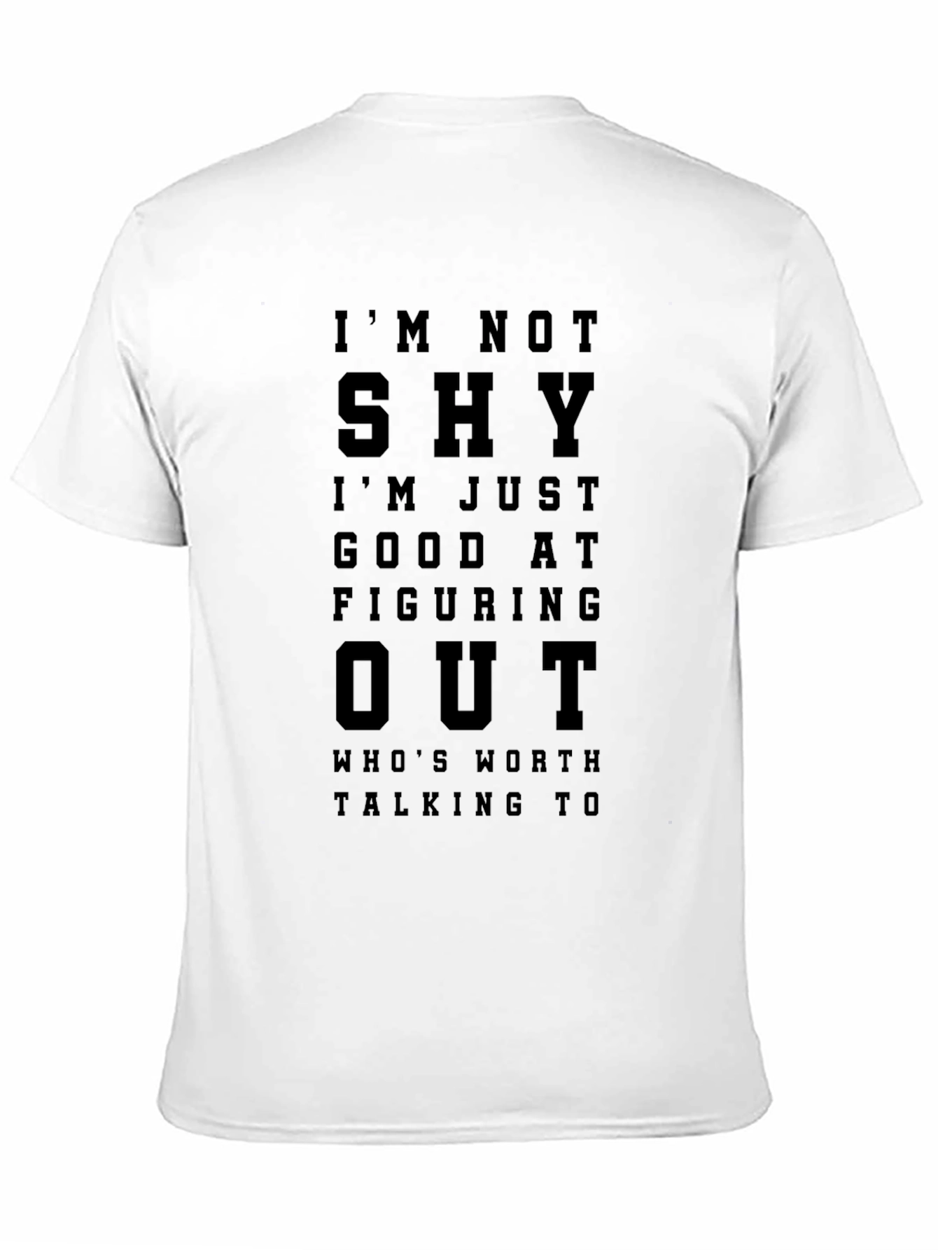 Make a statement with this bold black t-shirt. Featuring a witty saying, "I'm Not Shy, I'm Just Good at Figuring Out Who's Worth Talking To," this tee adds a touch of humor to your wardrobe. Crafted from comfortable fabric, this casual shirt is perfect for everyday wear. Pair it with jeans for a relaxed weekend look or dress it up with a jacket for a night out with friends. A comfortable way to express yourself, this tee is sure to turn heads!