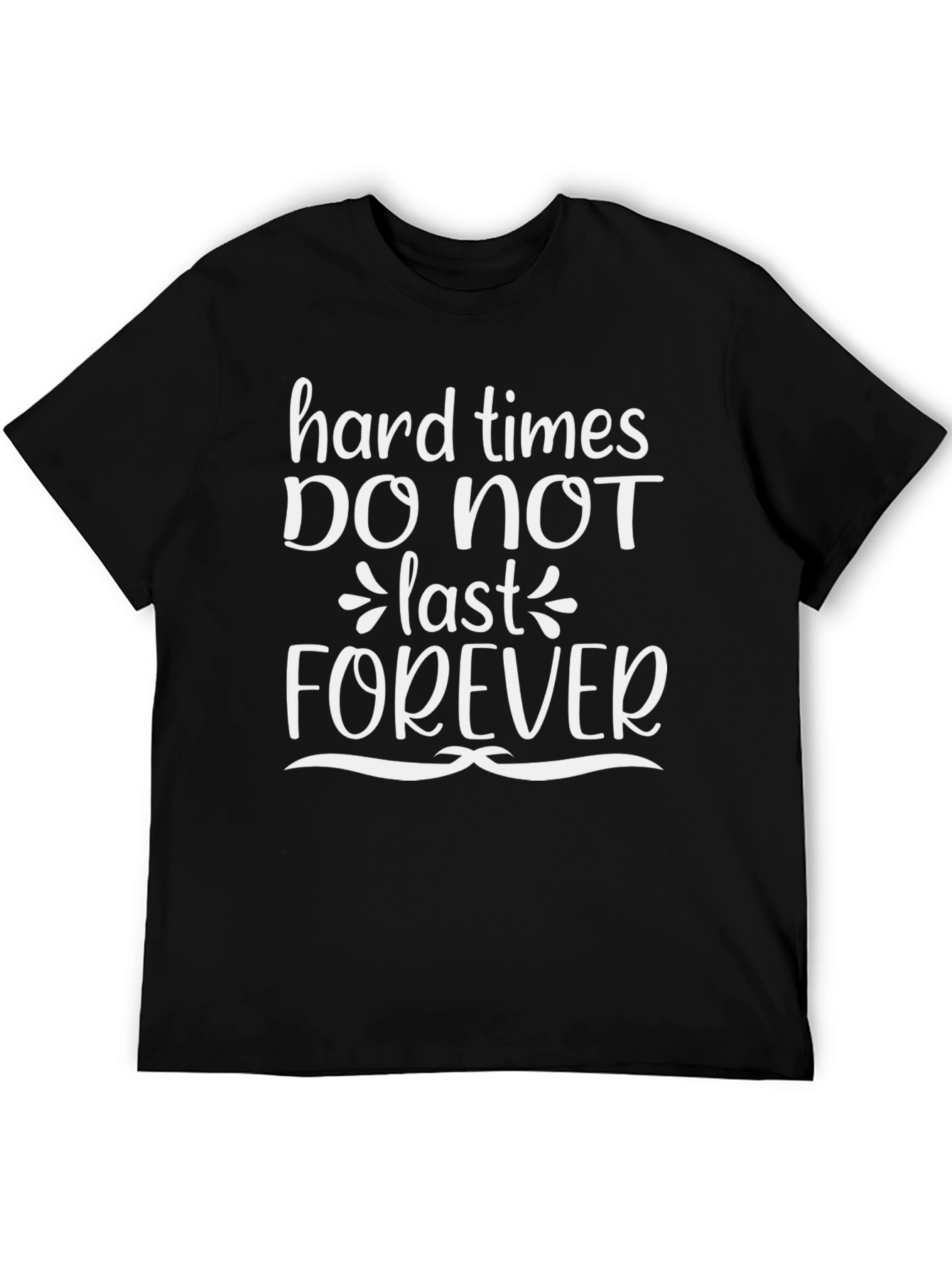 This classic black tee features a bold, inspirational message in a crisp white font: "Hard Times Do Not Last Forever." The design is eye-catching, making it a great conversation starter. Made from what appears to be a soft, breathable cotton blend, this shirt offers both comfort and style. The t-shirt has a regular fit and short sleeves, making it suitable for everyday wear. Ideal for anyone needing a little encouragement or wanting to spread positivity, this tee is perfect for casual outings, gym sessions, or simply lounging at home. A stylish reminder that tough times are temporary. This product comes in black color and is available in unisex sizes.