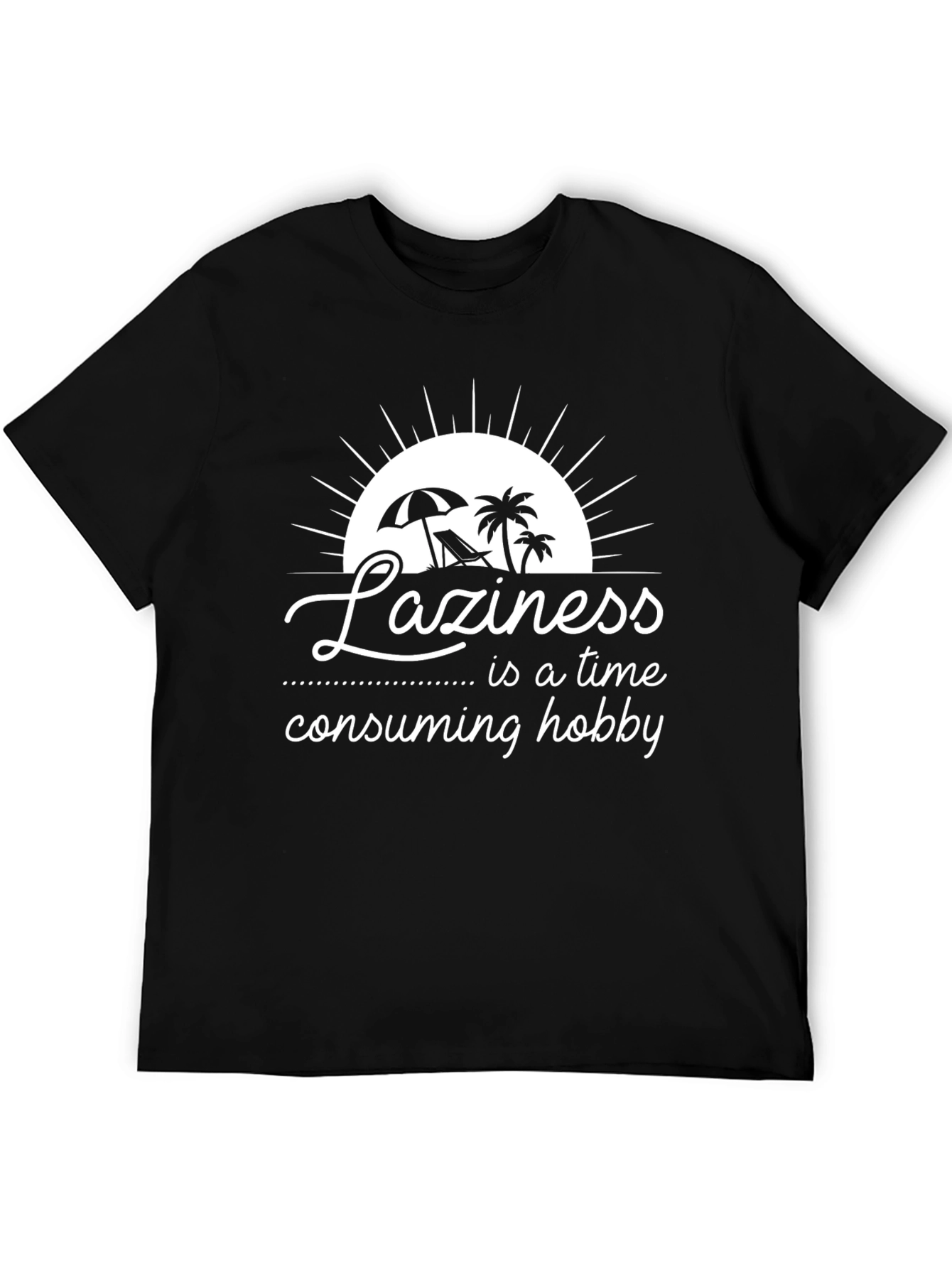 Embrace relaxation with this novelty graphic t-shirt. The black tee features a whimsical design of a sun, beach chair, and palm trees, topped with the phrase "Laziness is a time consuming hobby." Made from what appears to be soft, comfortable cotton, this shirt is perfect for casual wear, beach outings, or summer vacations. Show off your laid-back lifestyle with this unique and humorous tee. It's sure to spark conversations and bring smiles wherever you go. Get yours today and make laziness your official hobby!