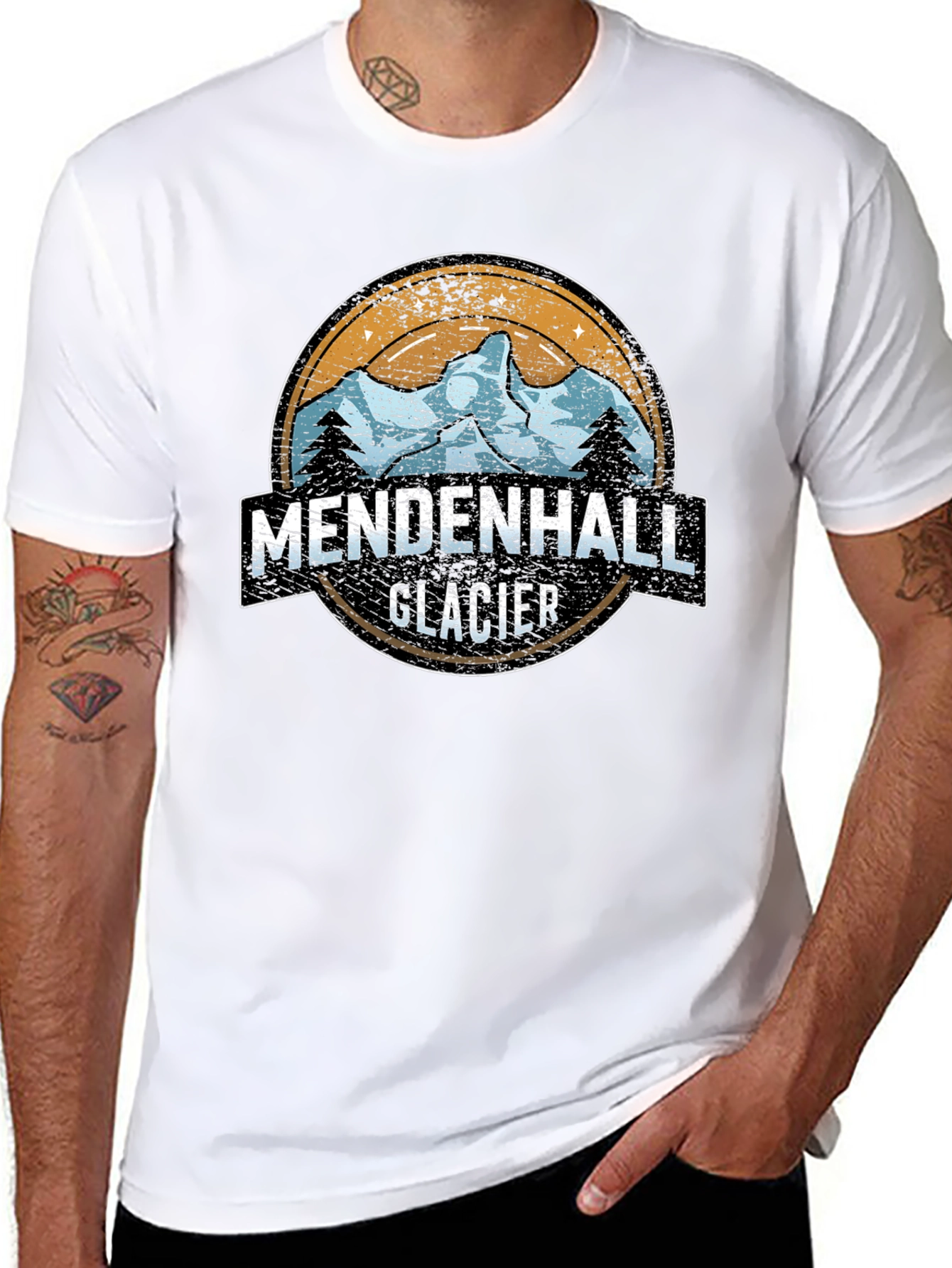 Embrace the spirit of adventure with this striking Mendenhall Glacier graphic tee. The black t-shirt showcases a vibrant, circular design featuring a majestic mountain range beneath a warm, sunlit sky. Towering pine trees frame the glacier, adding depth to the scene. Bold text declares "MENDENHALL GLACIER", making it a perfect memento or a statement of your love for nature. Crafted from comfortable, breathable fabric, this tee is ideal for casual wear, outdoor excursions, or simply showcasing your passion for the great outdoors. A unique addition to any wardrobe, capturing the essence of exploration.
