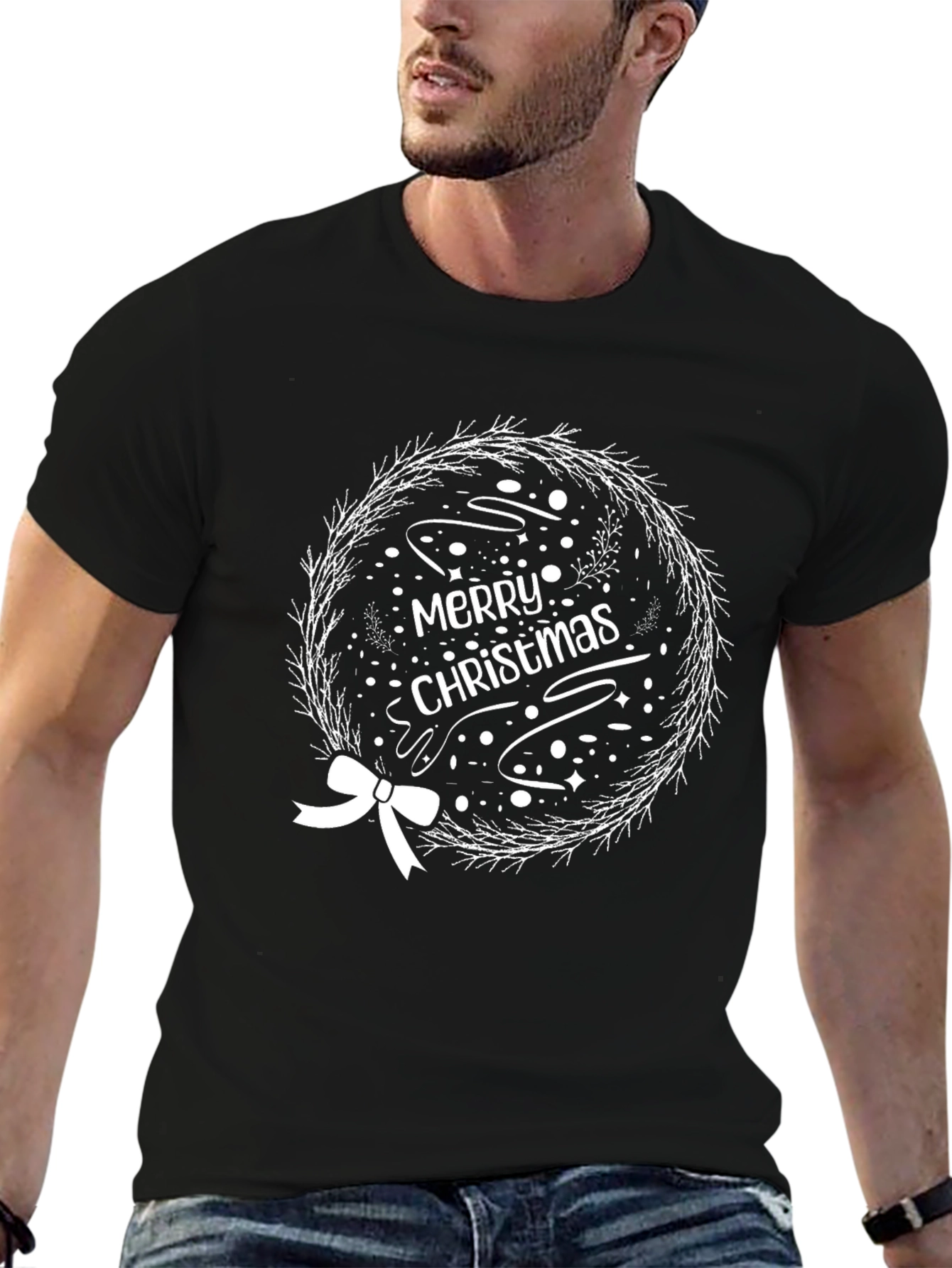 Spread holiday cheer with this stylish black t-shirt featuring a unique 'Merry Christmas' wreath design. The white graphic pops against the dark background, creating a visually striking contrast. The wreath is adorned with festive details like a bow and decorative elements, making it a perfect choice for casual holiday gatherings. Made from comfortable, breathable fabric, this tee is ideal for everyday wear during the Christmas season. Show off your festive spirit in comfort and style! A great gift or a fun addition to your own holiday wardrobe.
