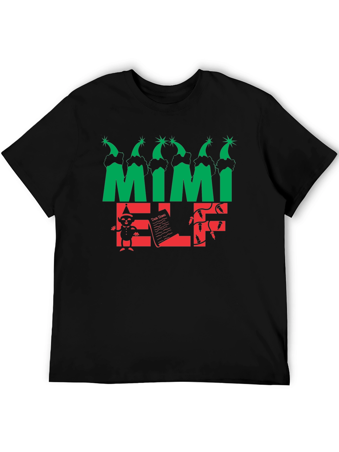 Spread holiday cheer with this festive "MIMI Elf" T-shirt. The design features a creative combination of lettering with playful elf graphics, including elf hats atop the word "MIMI" and a charming elf illustration alongside a scroll, spelling out "ELF". The vibrant green and red colors add a classic Christmas touch. Made from a comfortable, breathable fabric, this tee is perfect for holiday parties, family gatherings, or casual wear during the Christmas season. Show your festive spirit with this unique and eye-catching T-shirt!