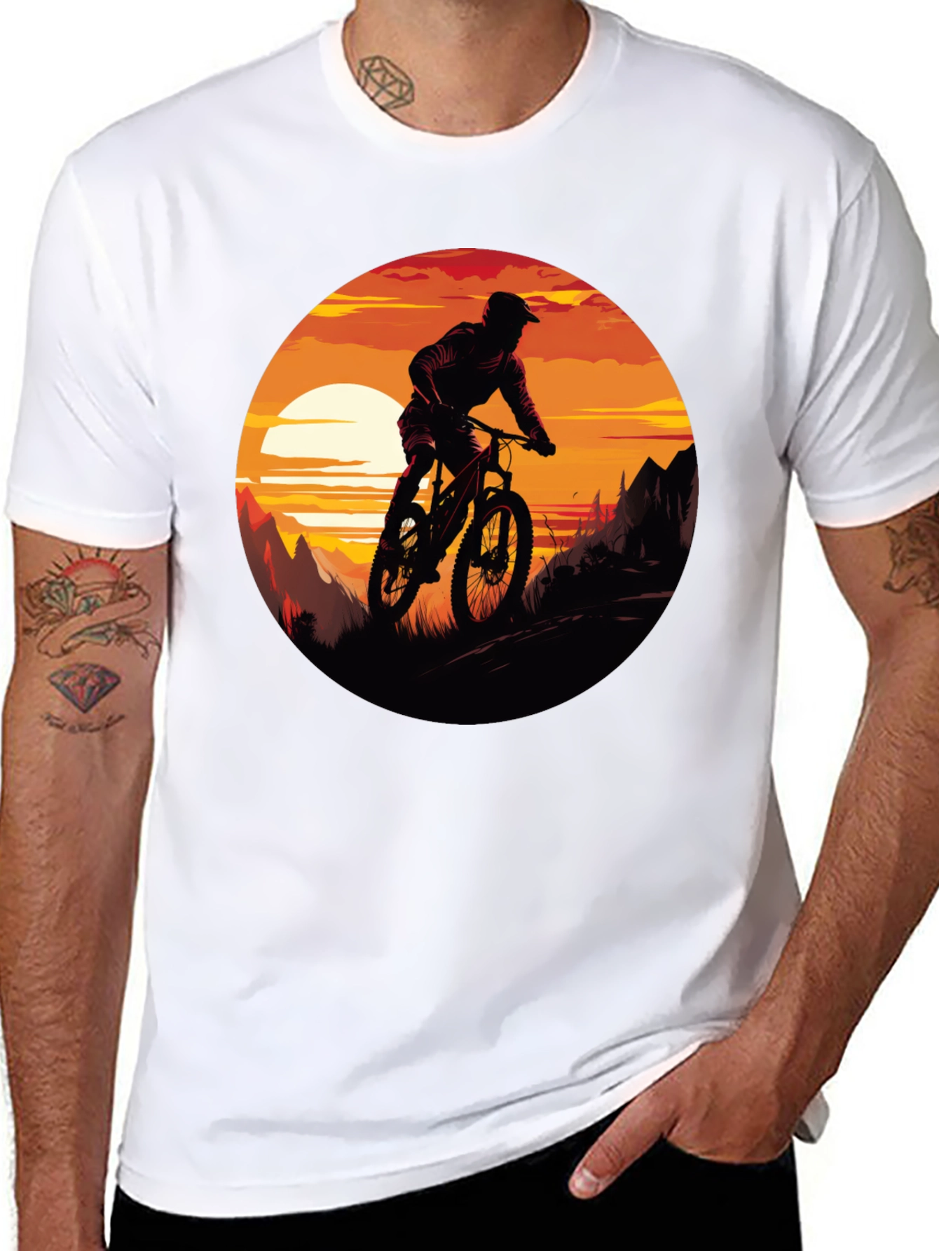 Embrace the thrill of the ride with this striking graphic tee. Featuring a bold silhouette of a mountain biker against a vibrant sunset backdrop, this tee captures the spirit of adventure. The design is printed on a comfortable, likely cotton, black t-shirt, perfect for everyday wear or your next outdoor excursion. Show off your passion for mountain biking with this eye-catching and durable tee. Ideal for casual outings, hiking, or simply relaxing after a long day on the trails. Get yours today and ride into the sunset!