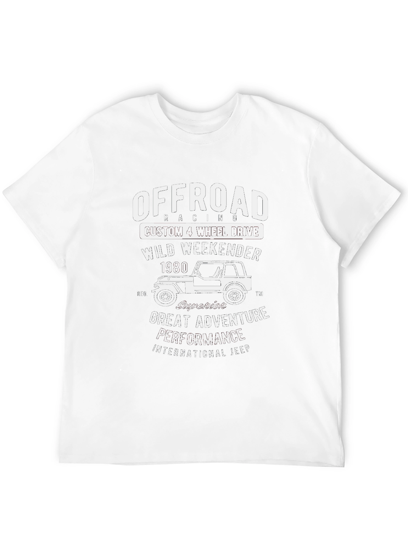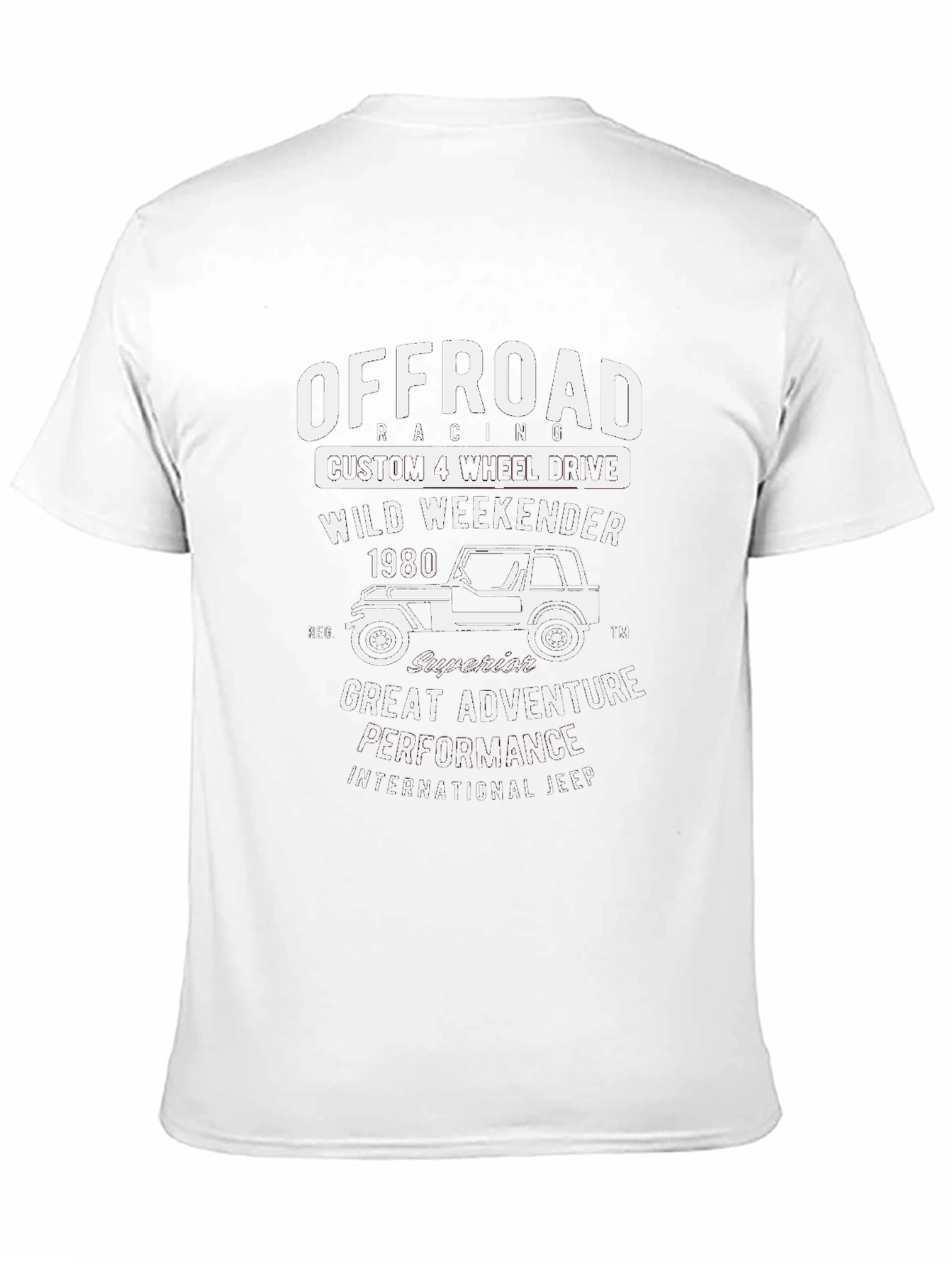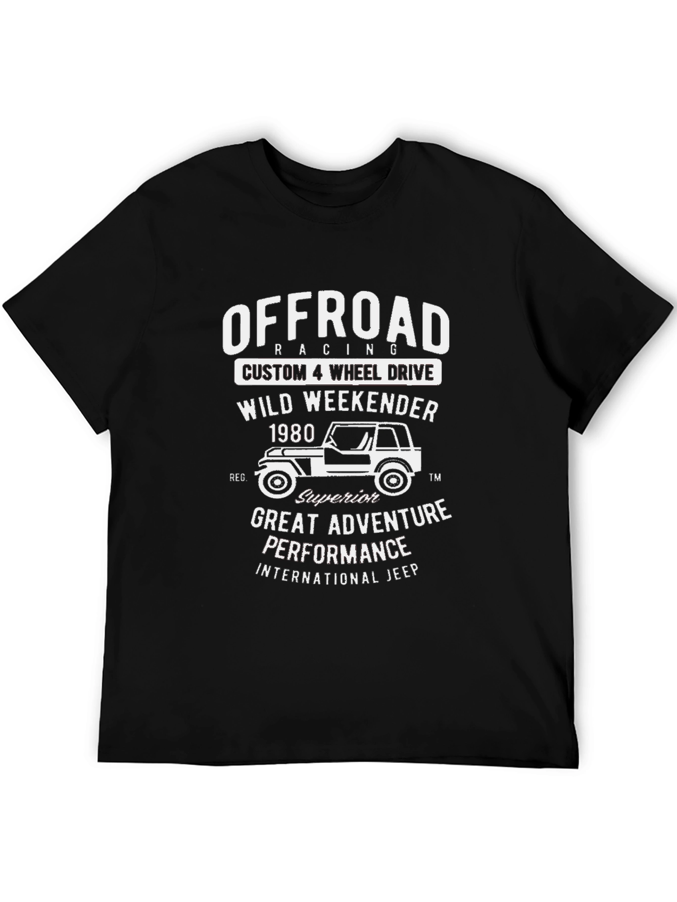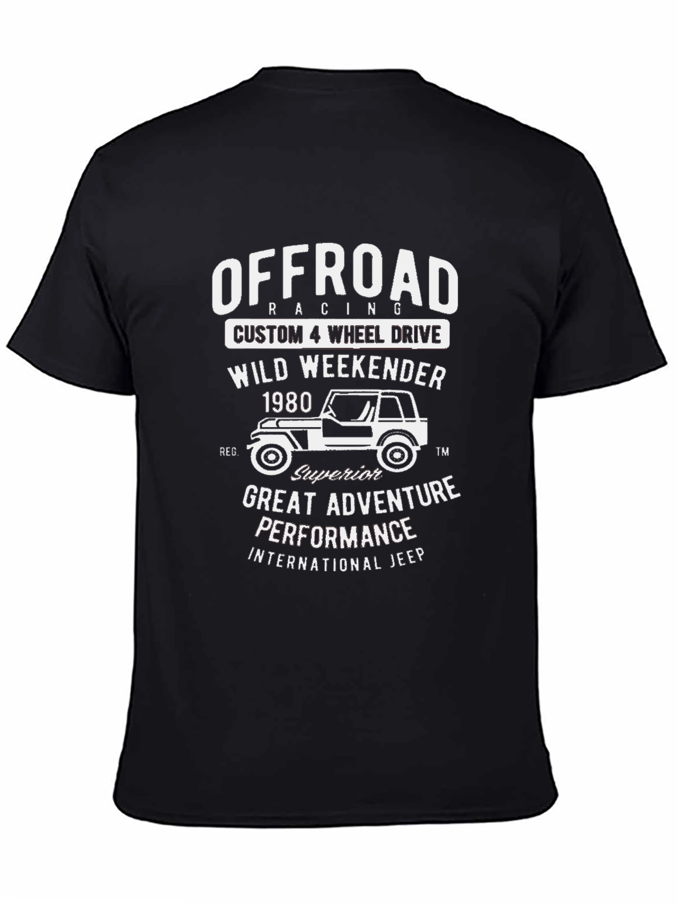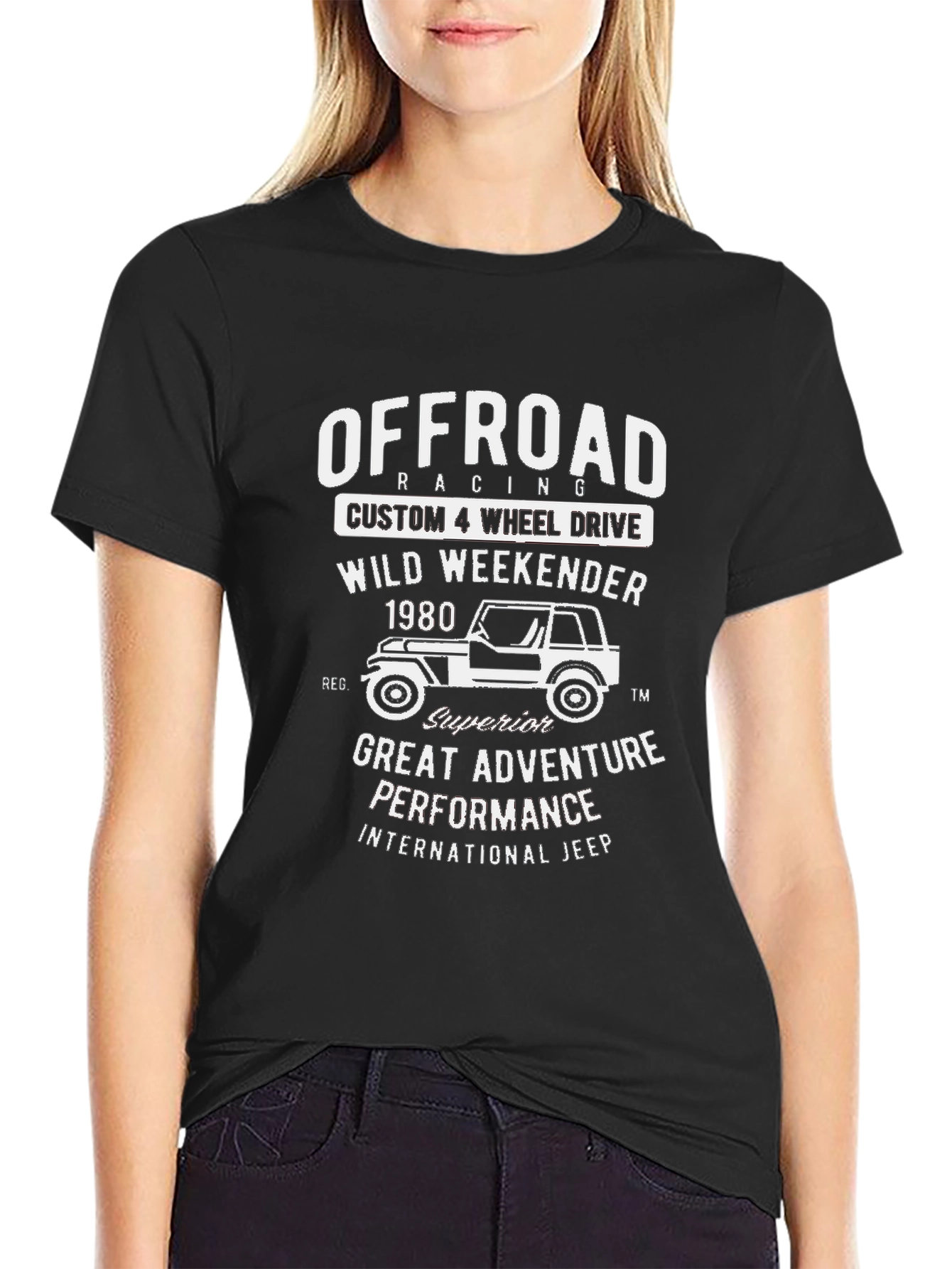 Show off your love for off-roading with this classic black t-shirt. Featuring a bold white graphic design, the shirt reads 'OFFROAD RACING' along with 'CUSTOM 4 WHEEL DRIVE', 'WILD WEEKENDER', and 'INTERNATIONAL JEEP'. The graphic also includes a vintage-style illustration of a 1980s jeep. Made from comfortable material, this tee is perfect for casual wear, car meets, off-road adventures, or relaxing on the weekends. Let everyone know you appreciate quality and performance with this unique tee!