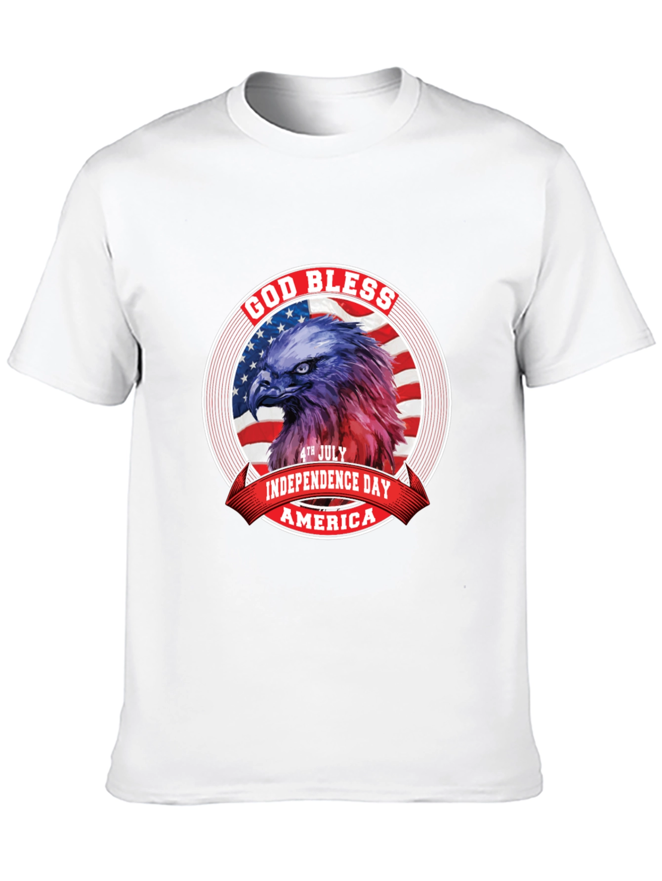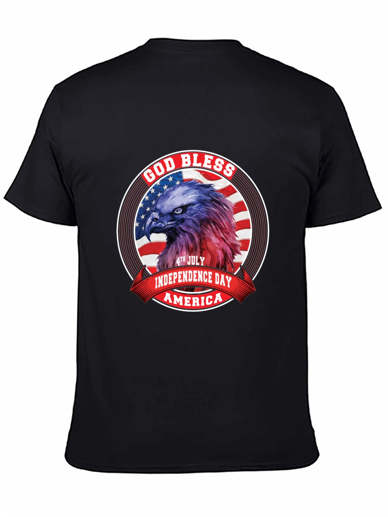 Show your patriotic spirit with this bold black T-shirt. The graphic features an American bald eagle with red and blue plumage set against the backdrop of the American flag. "God Bless America" and "Independence Day" are emblazoned above and below the eagle in striking red text. This tee is perfect for celebrating the 4th of July, Memorial Day, or any occasion where you want to display your love for the USA. Made from comfortable materials, it offers both style and comfort. Wear your pride!