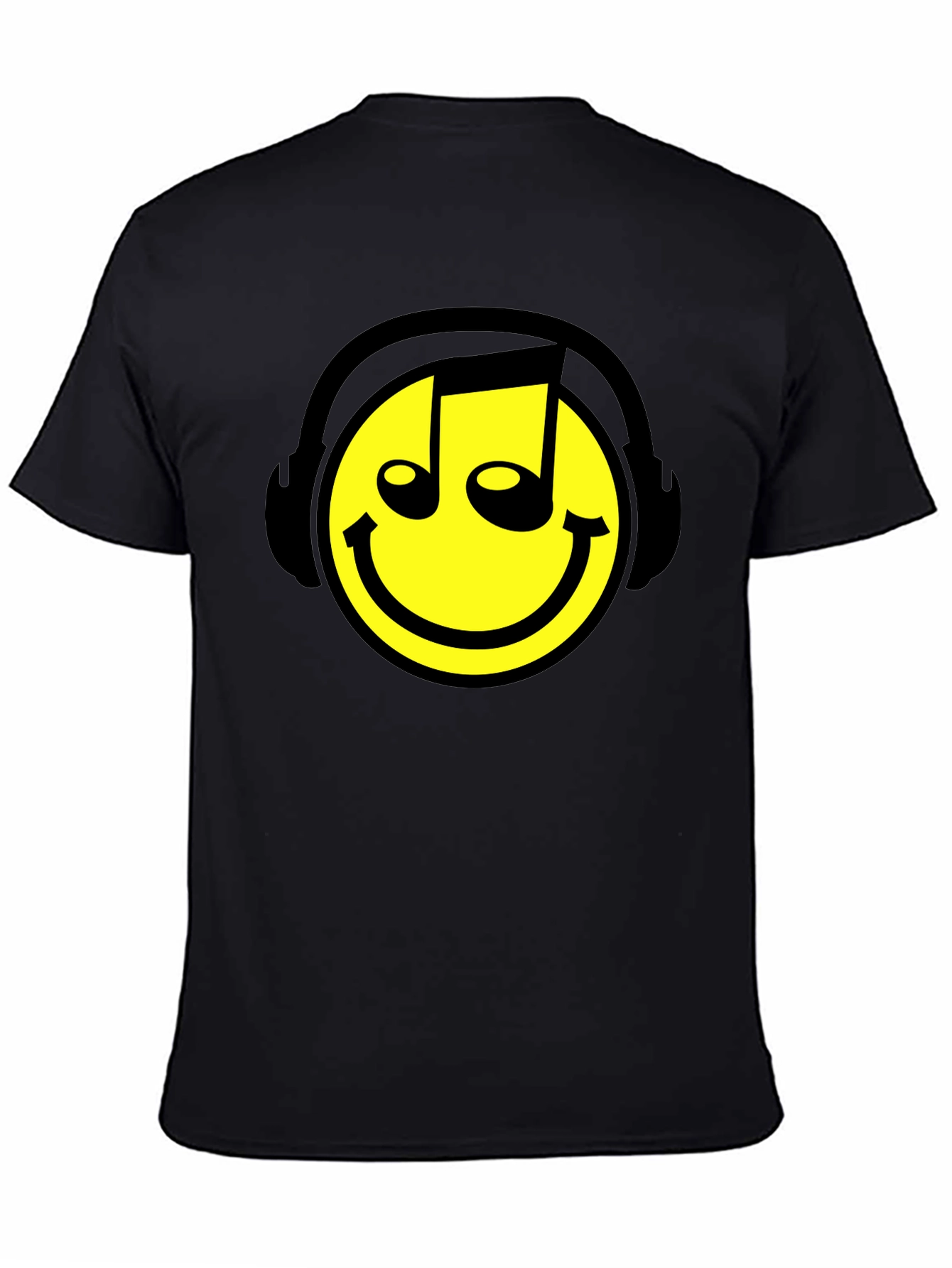 Rock this black t-shirt featuring a vibrant yellow smiley face wearing headphones and musical note eyes. This unique design blends music and fun, making it a perfect statement piece for music enthusiasts, DJs, or anyone who loves a playful twist in their wardrobe. Made from comfortable fabric, it's ideal for casual outings, concerts, or just expressing your passion for music. Its bold graphic ensures you'll stand out in style! Pair with jeans or shorts for a cool, laid-back look. Get ready to spread some musical joy!