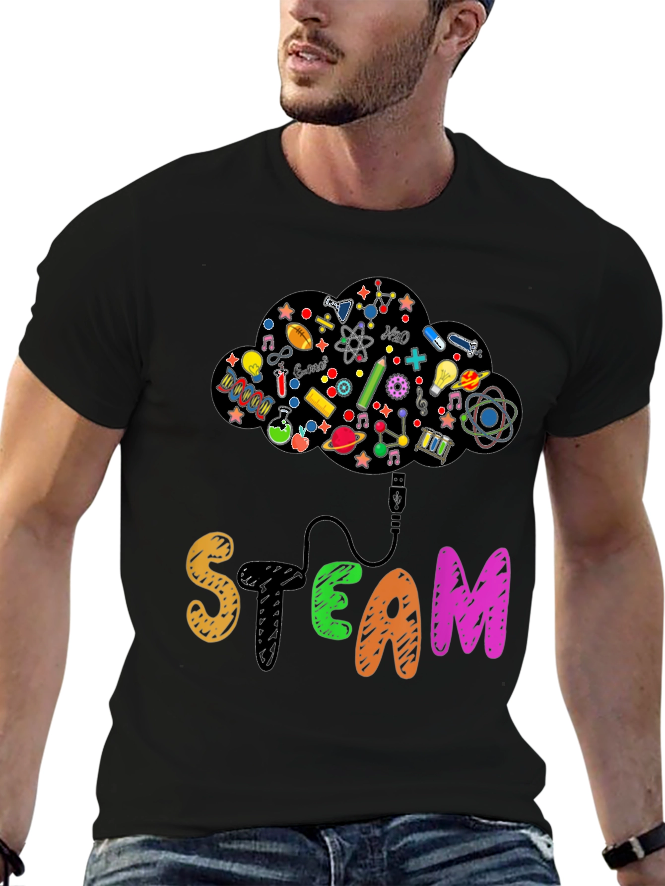 Show off your passion for STEAM with this eye-catching black t-shirt. The design features a vibrant cloud graphic filled with science, technology, engineering, art, and math-related images, seemingly powered by a USB connected to the word "STEAM" written in colorful playful lettering. This tee is perfect for teachers, students, or anyone who loves science and technology. Made from a comfortable fabric, it's ideal for everyday wear, science fairs, or casual outings. Spark curiosity and promote STEAM awareness with this unique and stylish tee!
