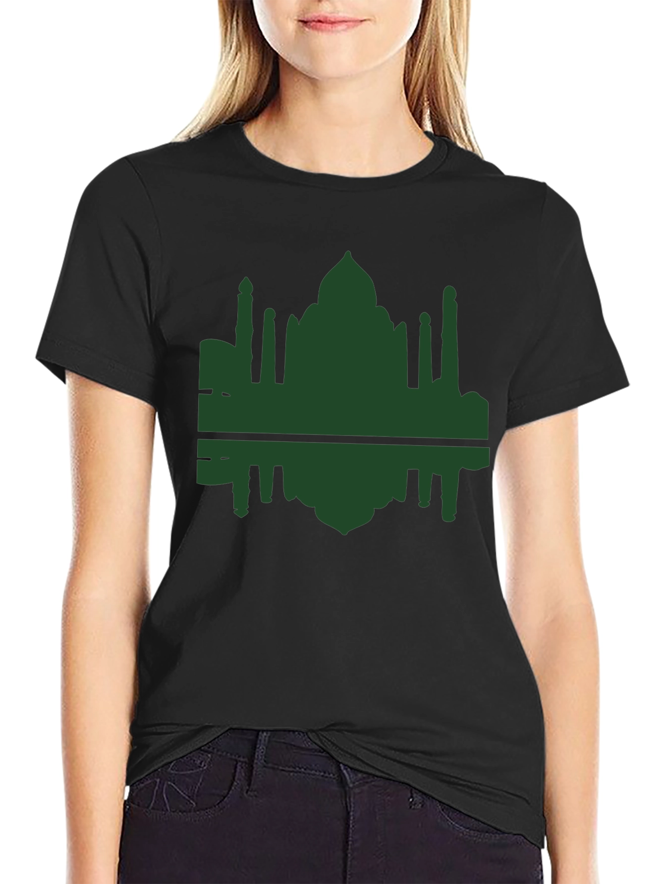 Showcase your love for travel and iconic landmarks with this stylish black t-shirt. Featuring a unique green silhouette graphic of the Taj Mahal with a mirrored reflection, this tee is sure to turn heads. The design is printed on a comfortable cotton blend, perfect for everyday wear. Dress it up with a blazer or keep it casual with jeans. Ideal for travelers, history buffs, or anyone who appreciates eye-catching designs, this shirt is a must-have addition to your wardrobe. Express your individuality and stand out from the crowd with this standout graphic tee!