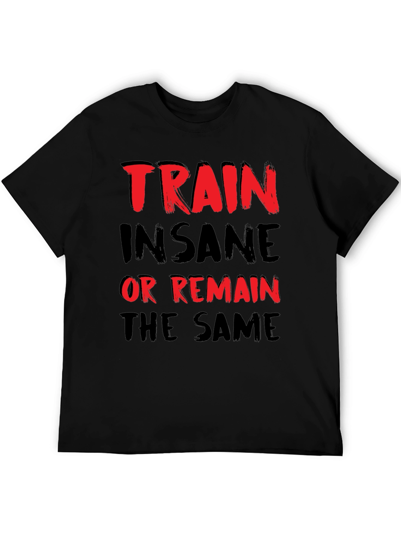 Show off your dedication to fitness with this striking graphic tee. The shirt features bold text in a distressed style, reading "TRAIN INSANE OR REMAIN THE SAME," making a powerful statement. The design contrasts vibrant red text against the black material, creating a visually appealing look. Made from a comfortable fabric, this t-shirt is perfect for workouts or casual wear, inspiring you to push your limits. Pair it with your favorite workout gear for a gym session or jeans for a relaxed, everyday look.