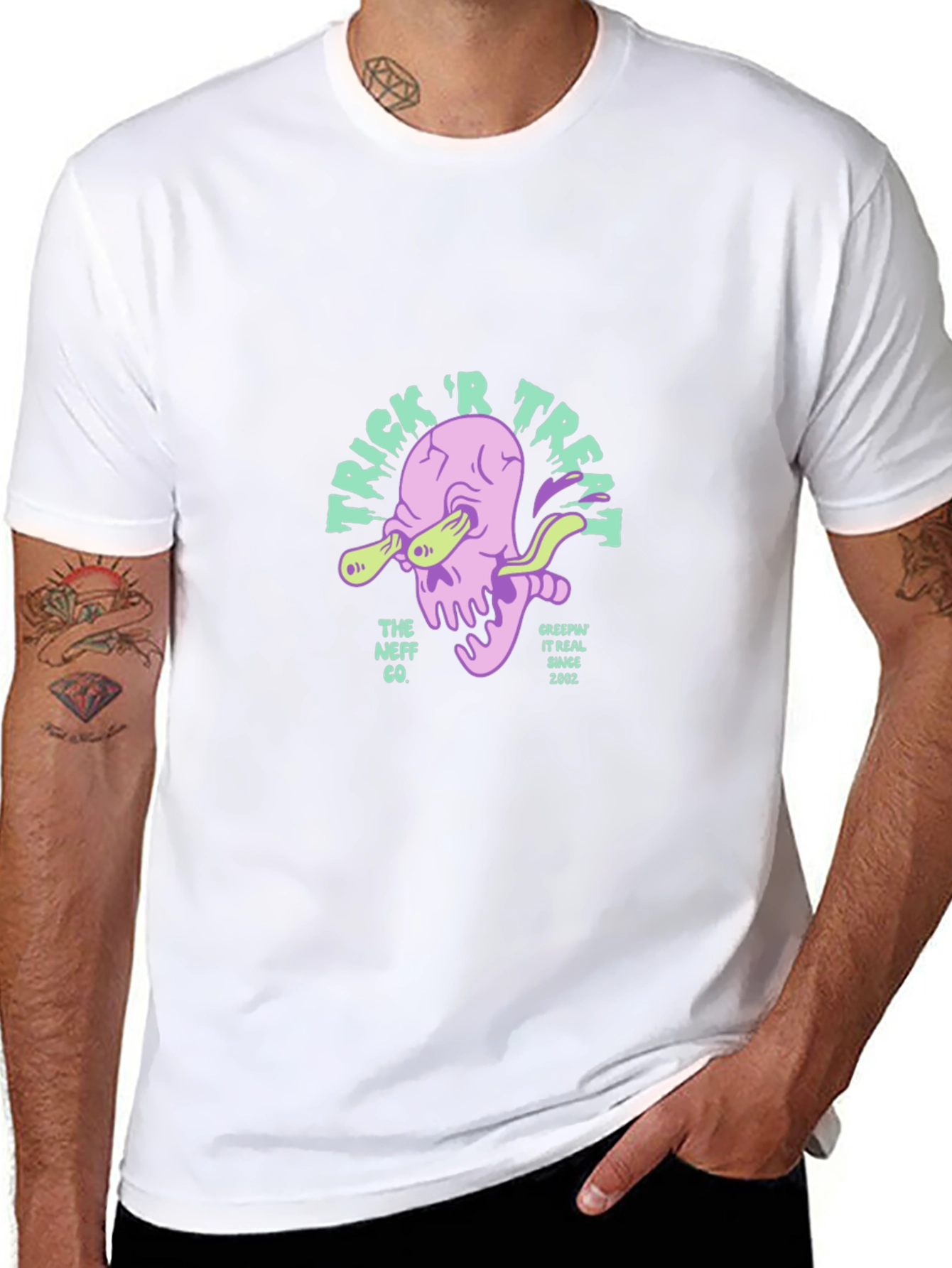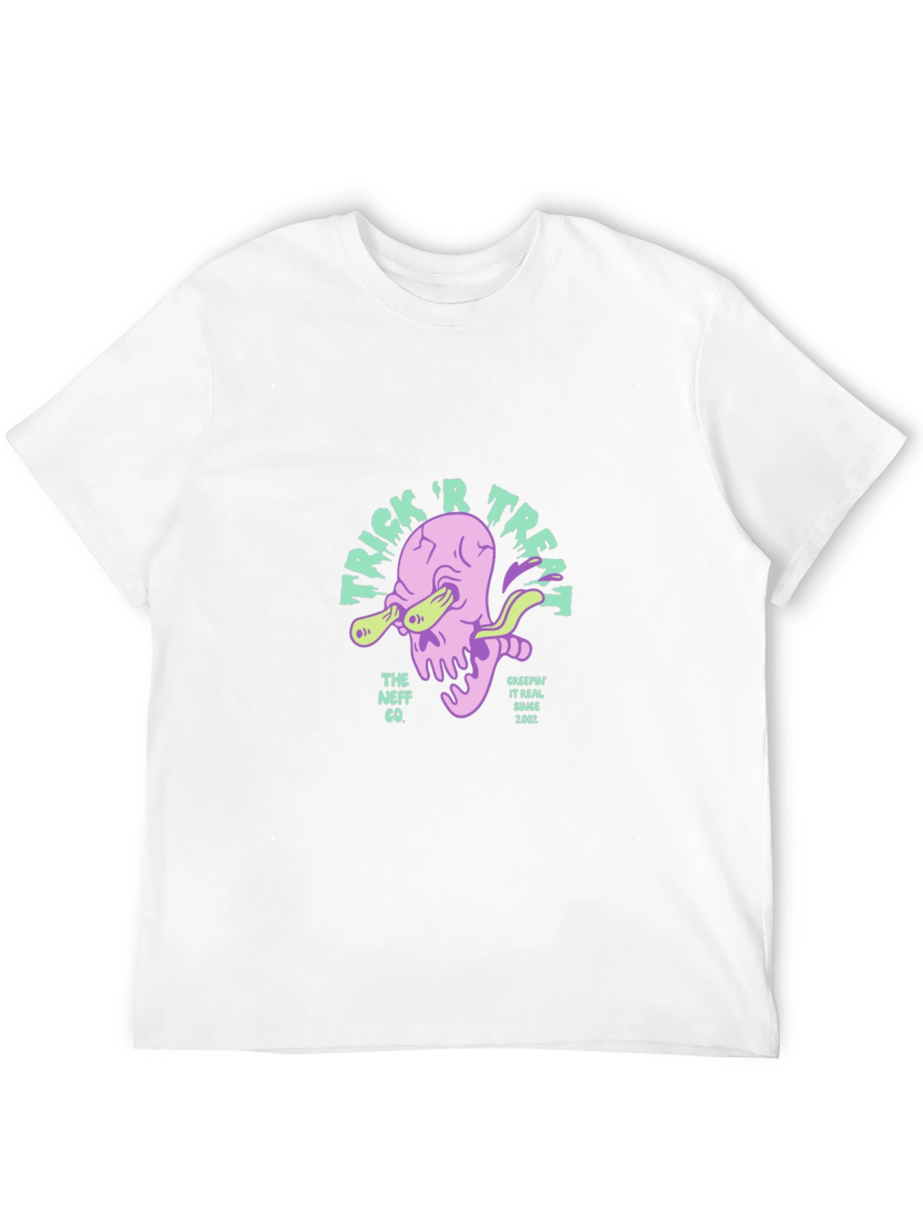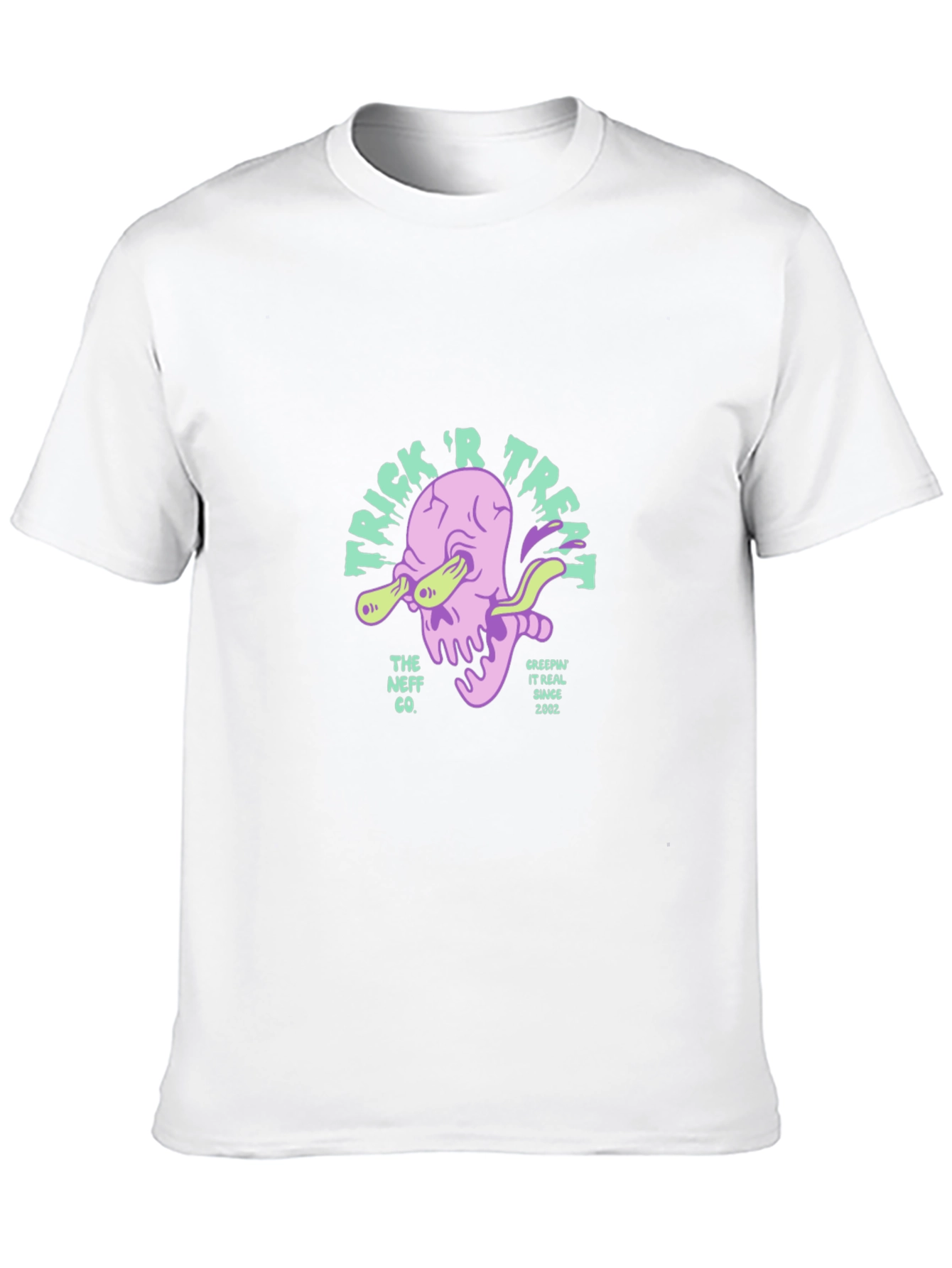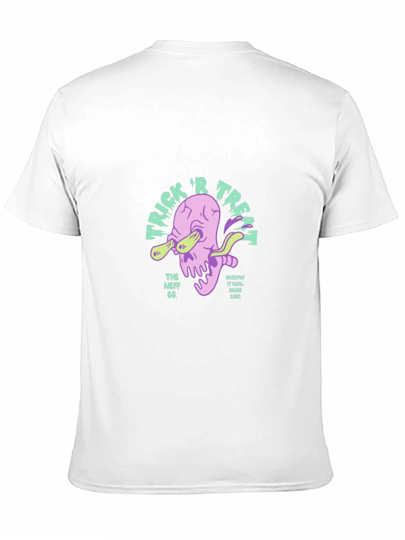 Get ready for Halloween with this unique Trick 'r Treat t-shirt from The Neff Co.! This eye-catching black tee features a playful and spooky design, showcasing a ghostly figure with the words "Trick 'r Treat" in a fun, whimsical font. The graphic also includes "Creep'n it real since 2002". Made from a comfortable and breathable fabric, this shirt is perfect for casual wear or adding a festive touch to your Halloween celebrations. Show off your spooky style with this cool and comfortable t-shirt.