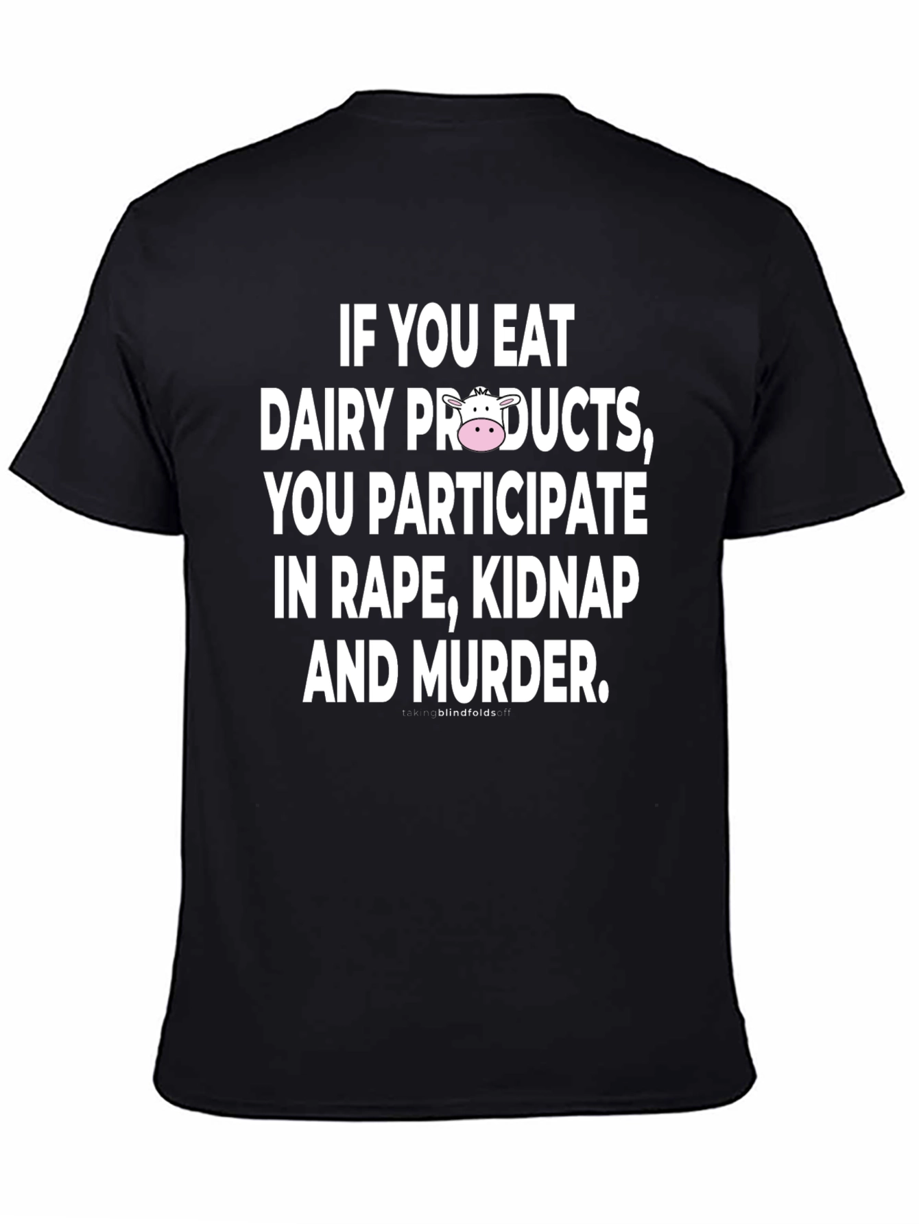 This bold black T-shirt features a provocative white text design stating: "IF YOU EAT DAIRY PRODUCTS, YOU PARTICIPATE IN RAPE, KIDNAP AND MURDER." A cartoon cow face is integrated into the text. The tee is a classic fit, likely made from comfortable cotton or a cotton blend. The shirt appears to be worn by a man with tattoos, adding to its edgy and statement-making appeal. This T-shirt is perfect for making a strong statement and expressing vegan activism. Wear it to protests, rallies, or as a conversation starter about animal rights.