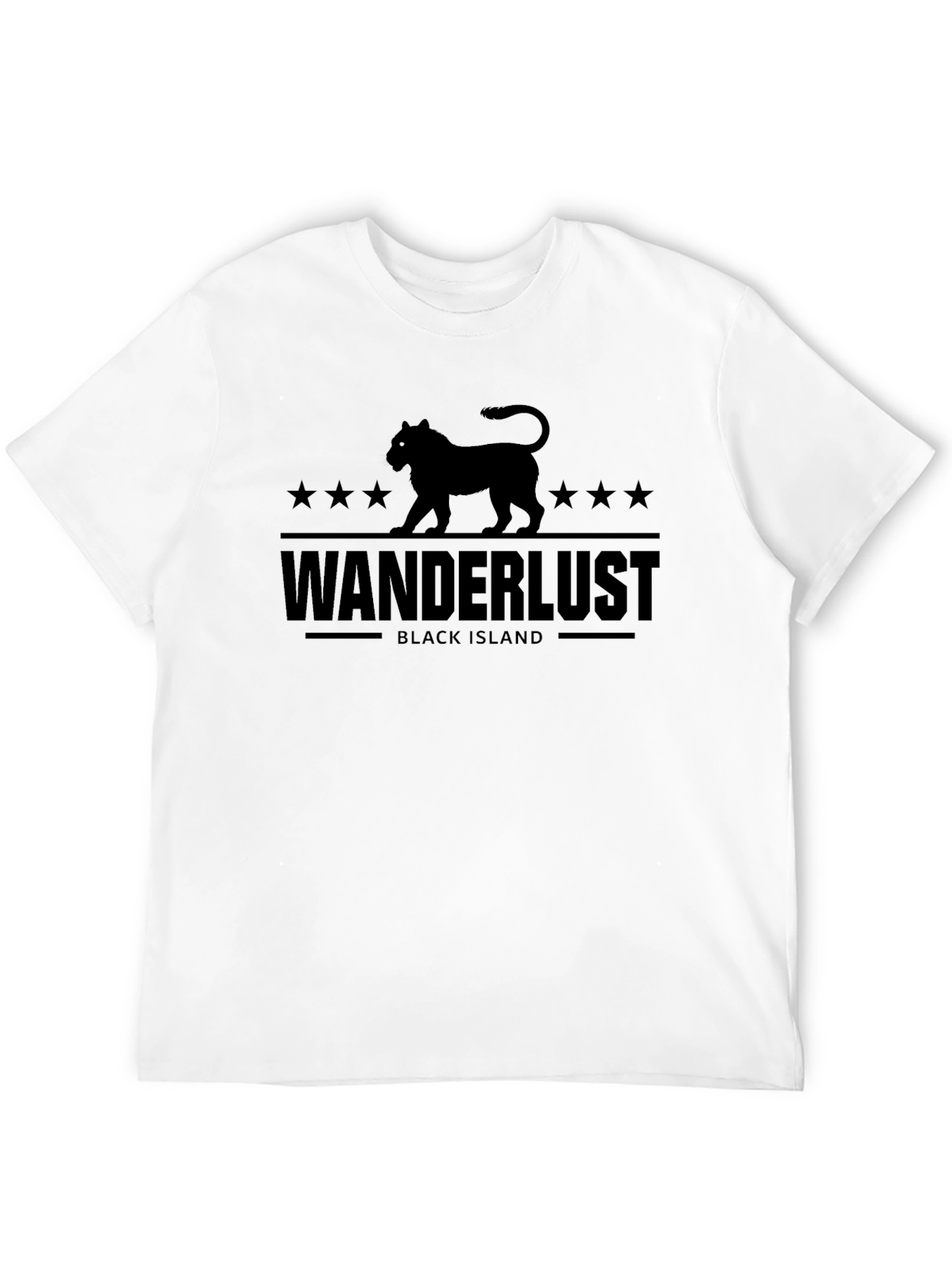 Embrace your adventurous spirit with this stylish Wanderlust Black Island T-shirt. The solid black tee features a bold graphic design, incorporating a sleek panther silhouette, stars, and prominent 'Wanderlust' text above 'Black Island'. Made from soft, breathable fabric, it ensures all-day comfort. This versatile shirt is perfect for casual outings, travel adventures, or everyday wear. Pair it with jeans or shorts for a relaxed, trendy look. Make a statement and showcase your love for exploration with this unique graphic tee.