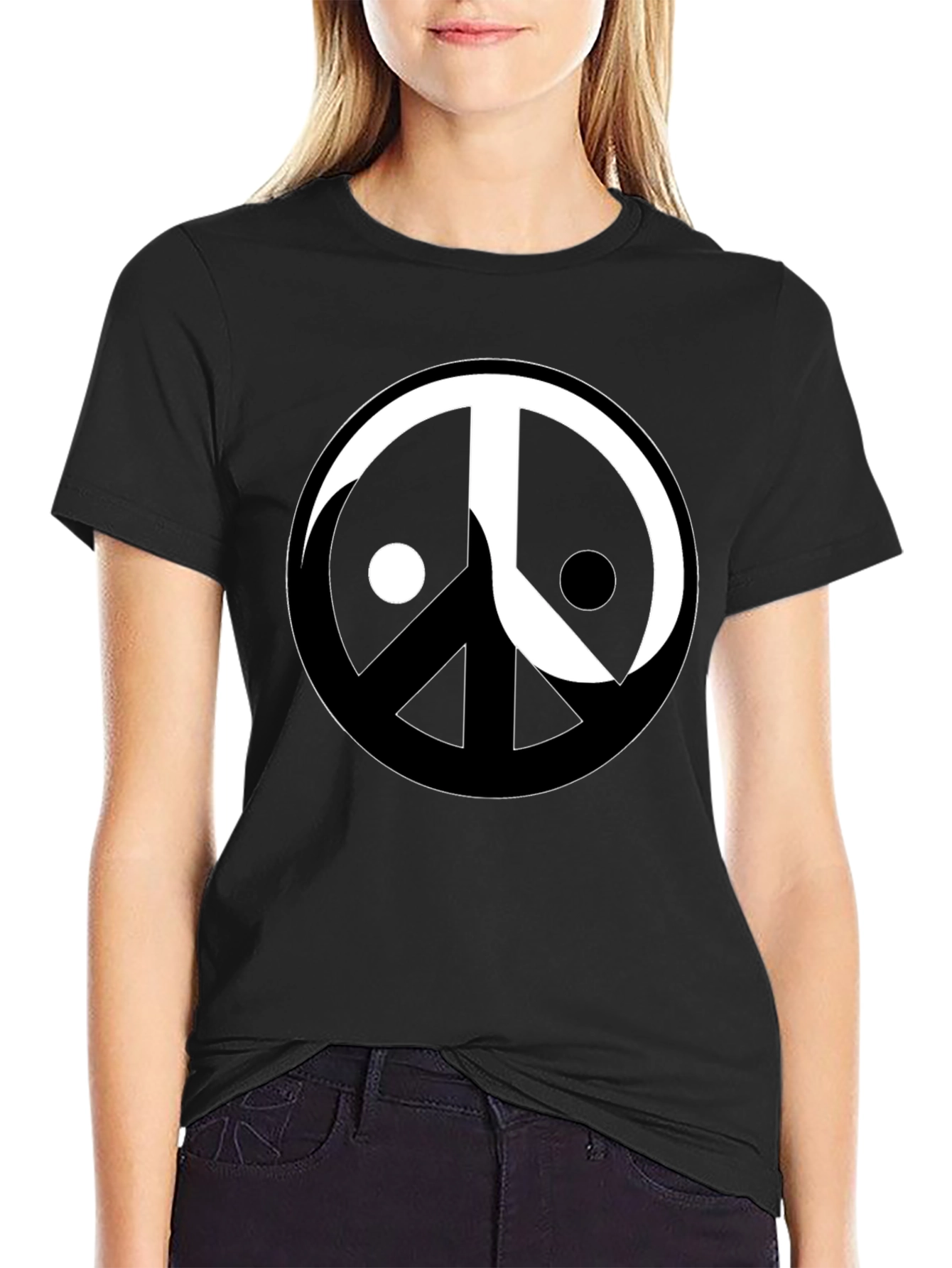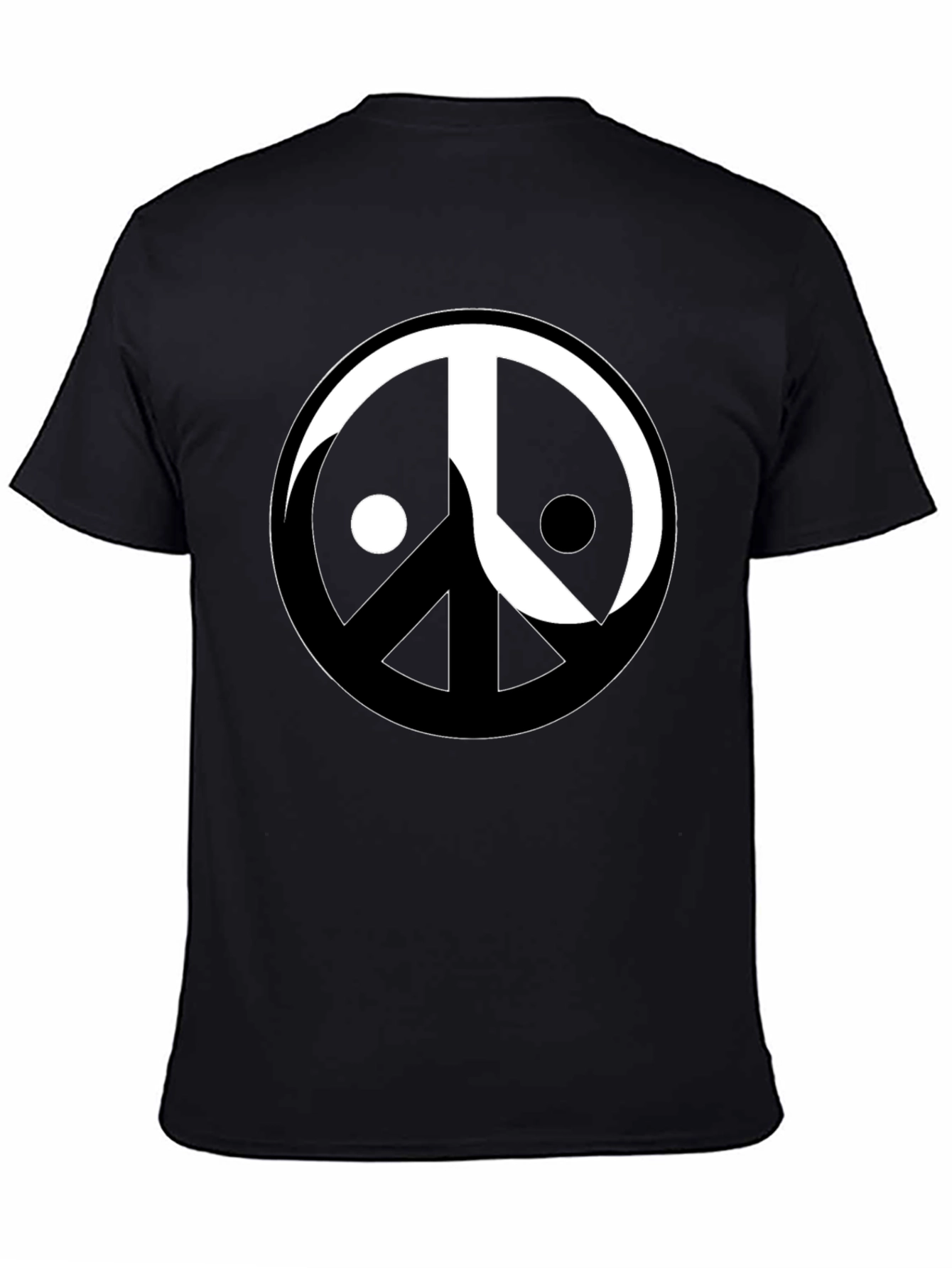 Embrace balance and peace with this stylish black graphic tee. Featuring a unique Yin Yang design seamlessly integrated with the iconic peace symbol, this shirt is a statement piece for those who value harmony and self-expression. Made from a comfortable, breathable fabric, it's ideal for everyday wear. The bold black color makes it versatile and easy to pair with jeans, shorts, or casual pants. Show off your individual style and spread a message of tranquility with this eye-catching tee. Perfect for casual outings, concerts, or simply lounging in comfort.