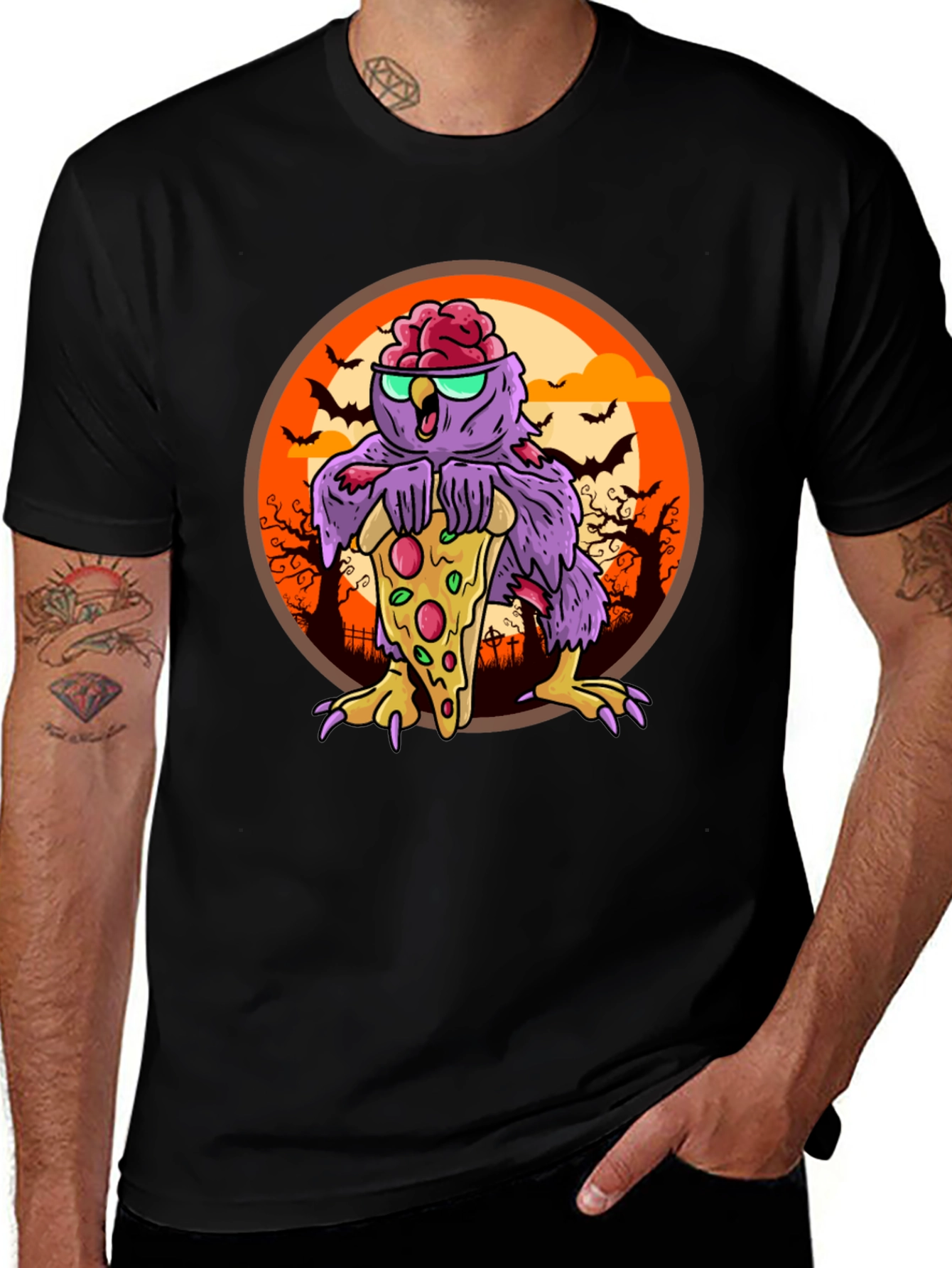 Rock this unique black t-shirt featuring a zombified owl devouring a slice of delicious pizza! The eye-catching design boasts a quirky purple owl with visible brain, green glasses, and spooky Halloween backdrop. This comfortable shirt is made from soft, breathable fabric. It's perfect for pizza lovers, Halloween enthusiasts, or anyone who enjoys fun, quirky apparel. Show off your unique sense of style with this standout tee. Wear it to parties, casual outings, or just chilling at home. Get yours today and add some fun to your wardrobe!